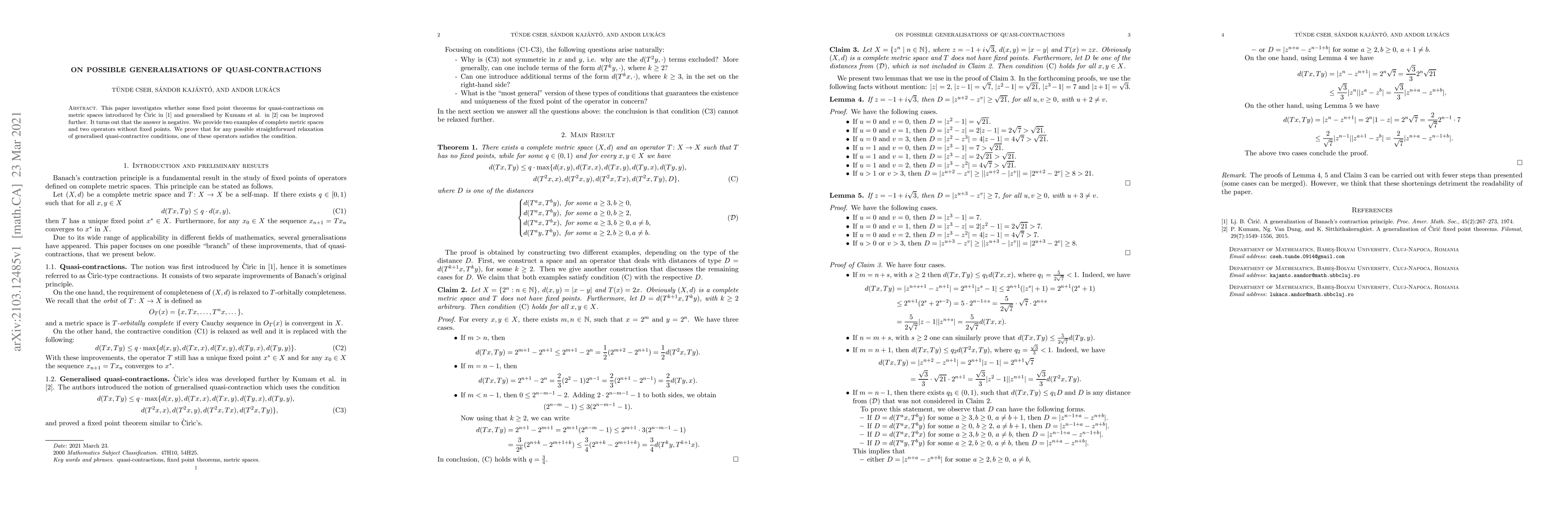 This paper investigates whether some fixed point theorems for quasi-contractions on metric spaces introduced by \`Cir\`ic in [1] and generalised by Kumam et al. in [2] can be improved further. It turns out that the answer is negative. We provide two examples of complete metric spaces and two operators without fixed points. We prove that for any possible straightforward relaxation of generalised quasi-contractive conditions, one of these operators satisfies the condition.