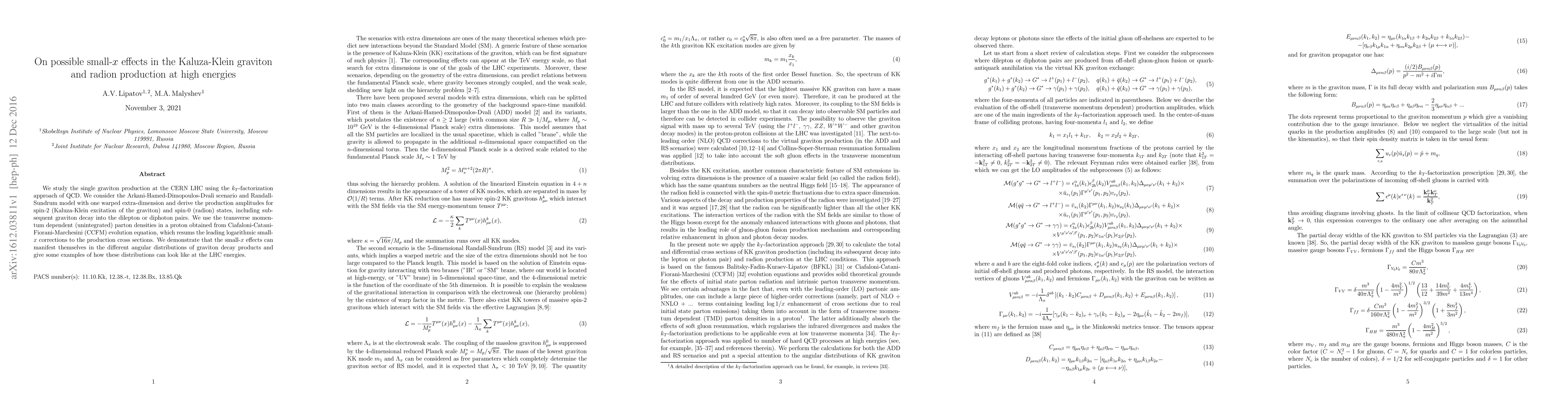 This paper investigates the production of Kaluza-Klein gravitons and radions at high energies using the $k_T$-factorization approach in the Arkani-Hamed-Dimopoulos-Dvali and Randall-Sundrum models. It highlights the potential for small-$x$ effects to influence the angular distributions of decay products, as derived from the CCFM evolution equation.