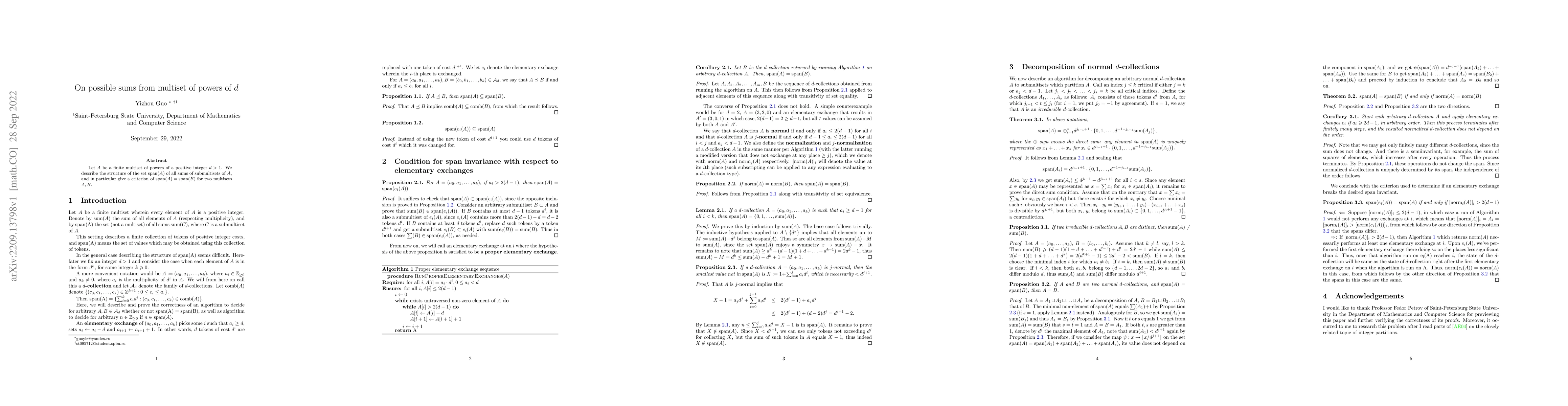 This paper investigates the structure of the set of all sums formed from submultisets of a given finite multiset $A$ composed of powers of a positive integer $d$. It provides a criterion for determining when two such multisets $A$ and $B$ yield the same set of sums.