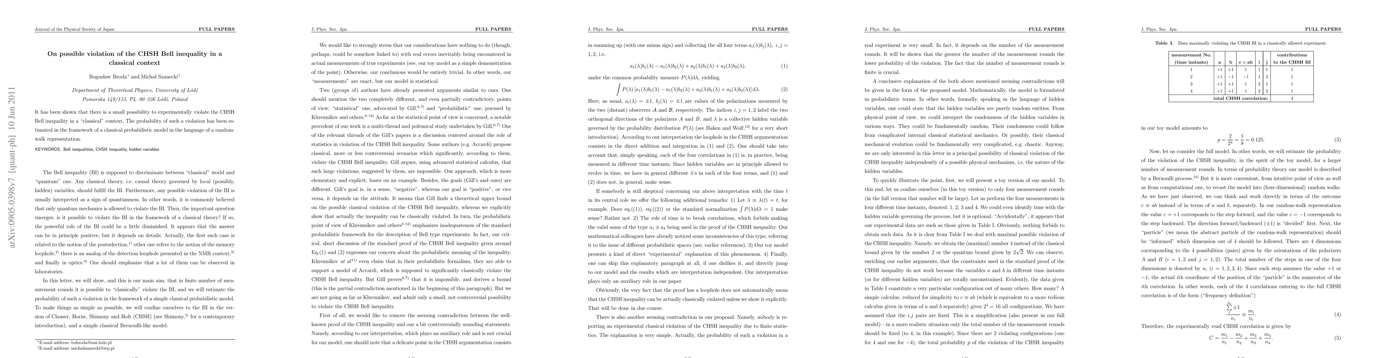 Summary: The research explores the potential for experimental violation of the CHSH Bell inequality within classical probabilistic models, estimating the likelihood using a random-walk representation. This study suggests a small probability of observing such violations in classical contexts.