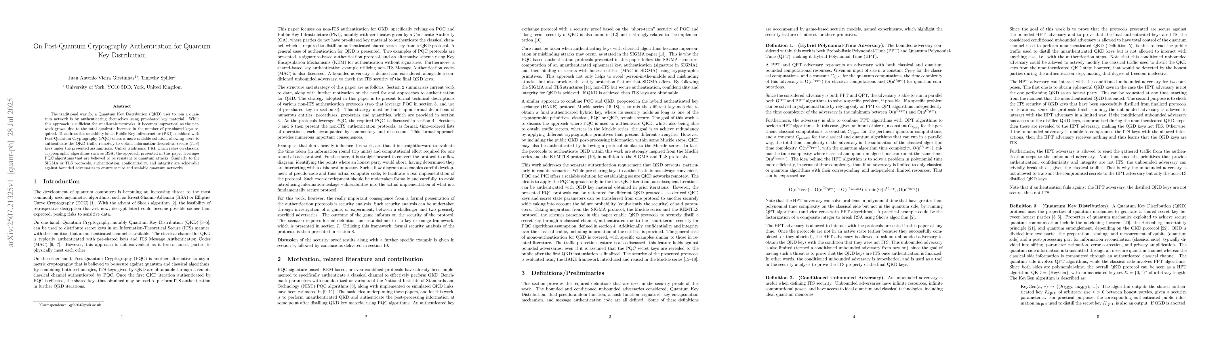 The traditional way for a Quantum Key Distribution (QKD) user to join a quantum network is by authenticating themselves using pre-shared key material. While this approach is sufficient for small-scale networks, it becomes impractical as the network grows, due to the total quadratic increase in the number of pre-shared keys required. To address this scalability issue, Public Key Infrastructure (PKI) combined with Post-Quantum Cryptography (PQC) offers a more scalable solution, allowing users to authenticate the QKD traffic remotely to obtain information-theoretical secure (ITS) keys under the presented assumptions. Unlike traditional PKI, which relies on classical cryptographic algorithms such as RSA, the approach presented in this paper leverages PQC algorithms that are believed to be resistant to quantum attacks. Similarly to the SIGMA or TLS protocols, authentication, confidentiality, and integrity are achievable against bounded adversaries to ensure secure and scalable quantum networks.