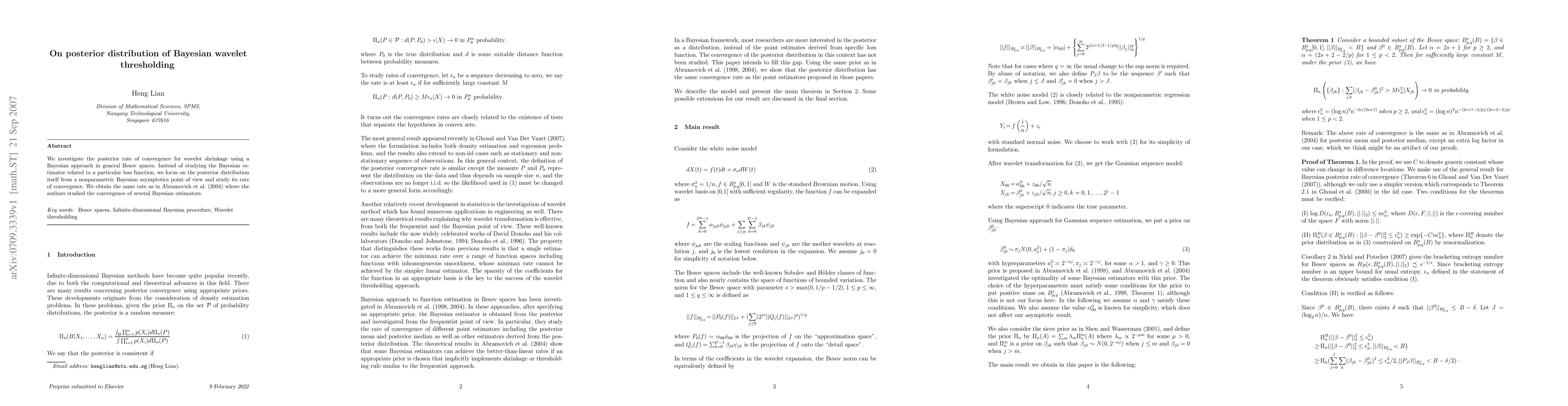 We investigate the posterior rate of convergence for wavelet shrinkage using a Bayesian approach in general Besov spaces. Instead of studying the Bayesian estimator related to a particular loss function, we focus on the posterior distribution itself from a nonparametric Bayesian asymptotics point of view and study its rate of convergence. We obtain the same rate as in \citet{abramovich04} where the authors studied the convergence of several Bayesian estimators.