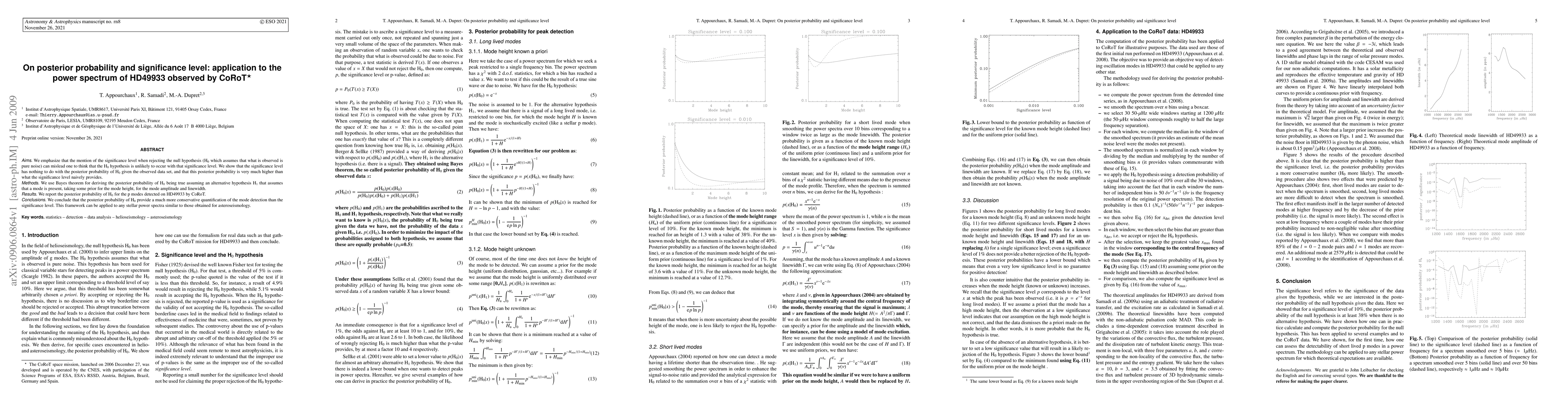 This paper clarifies the distinction between the significance level and the posterior probability of the null hypothesis in the context of detecting p modes in HD49933's power spectrum observed by CoRoT. It demonstrates that the posterior probability is significantly higher than the significance level suggests, providing a more conservative assessment of mode detection.