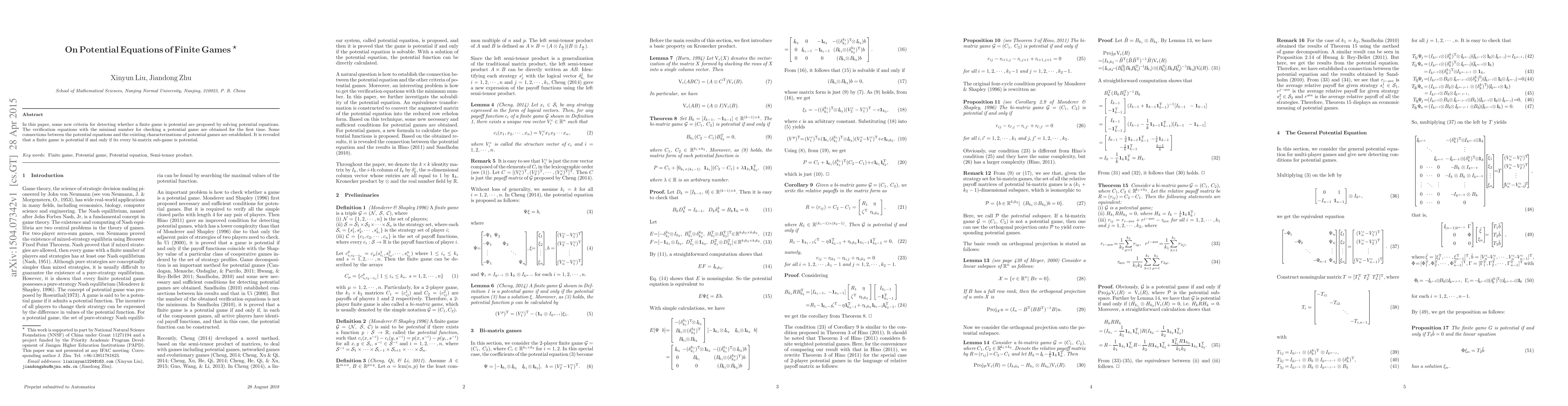 In this paper, some new criteria for detecting whether a finite game is potential are proposed by solving potential equations. The verification equations with the minimal number for checking a potential game are obtained for the first time. Some connections between the potential equations and the existing characterizations of potential games are established. It is revealed that a finite game is potential if and only if its every bi-matrix sub-game is potential.