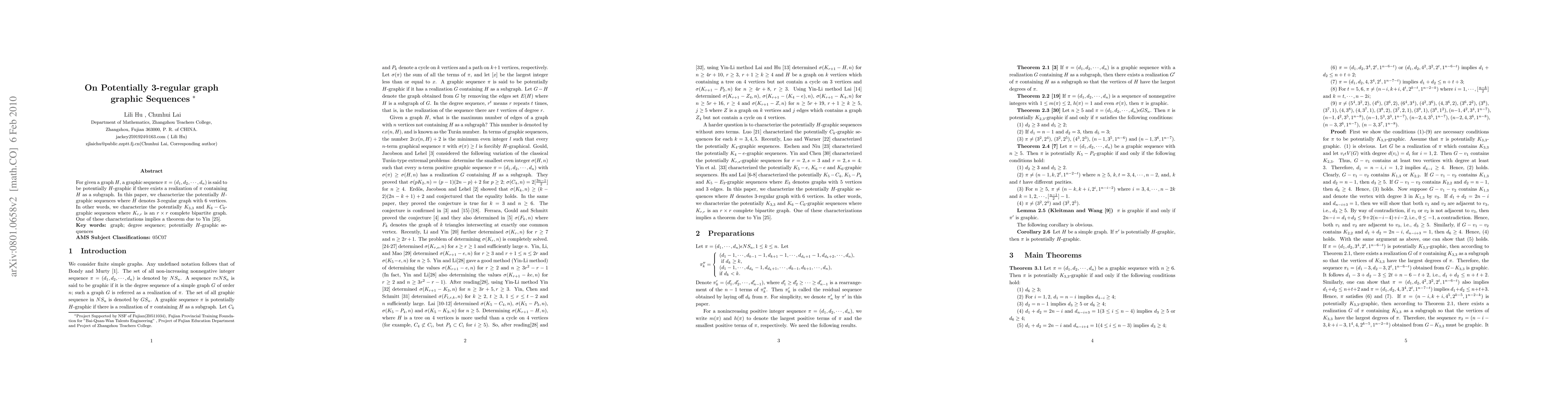 For given a graph $H$, a graphic sequence $\pi=(d_1,d_2,...,d_n)$ is said to be potentially $H$-graphic if there exists a realization of $\pi$ containing $H$ as a subgraph. In this paper, we characterize the potentially $H$-graphic sequences where $H$ denotes 3-regular graph with 6 vertices. In other words, we characterize the potentially $K_{3,3}$ and $K_6-C_6$-graphic sequences where $K_{r,r}$ is an $r\times r$ complete bipartite graph. One of these characterizations implies a theorem due to Yin [25].
