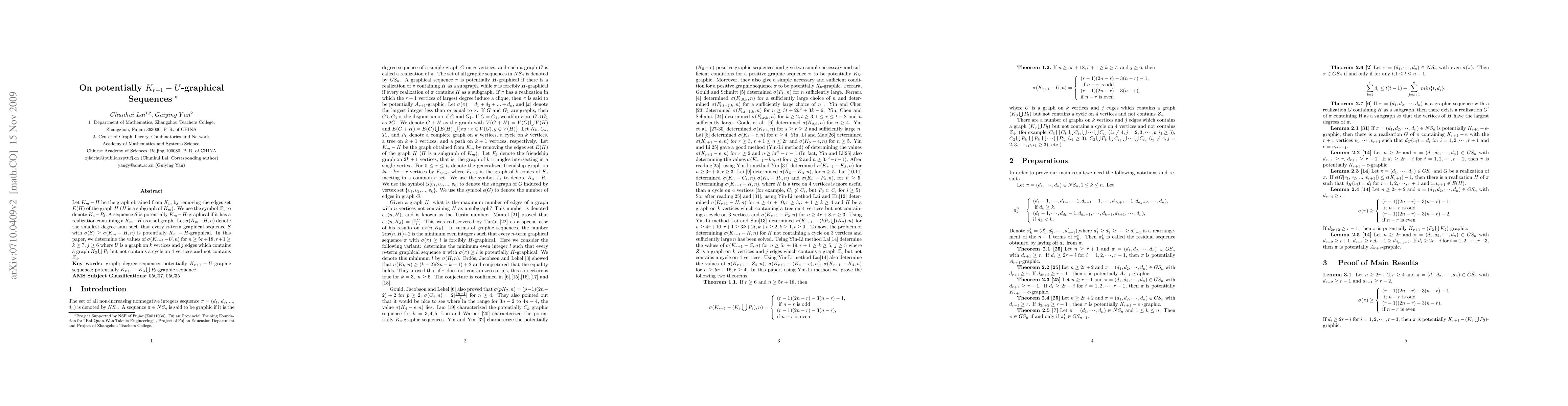This paper investigates potentially $K_{r+1}-U$-graphical sequences, determining the smallest degree sum $\sigma(K_{r+1}-U, n)$ for sequences that can realize a subgraph $K_{r+1}-U$ under specific conditions on $n$, $r$, $k$, and $j$. The focus is on $U$ graphs containing $K_3 \bigcup P_3$ but not cycles of length 4 or $K_4-P_2$.