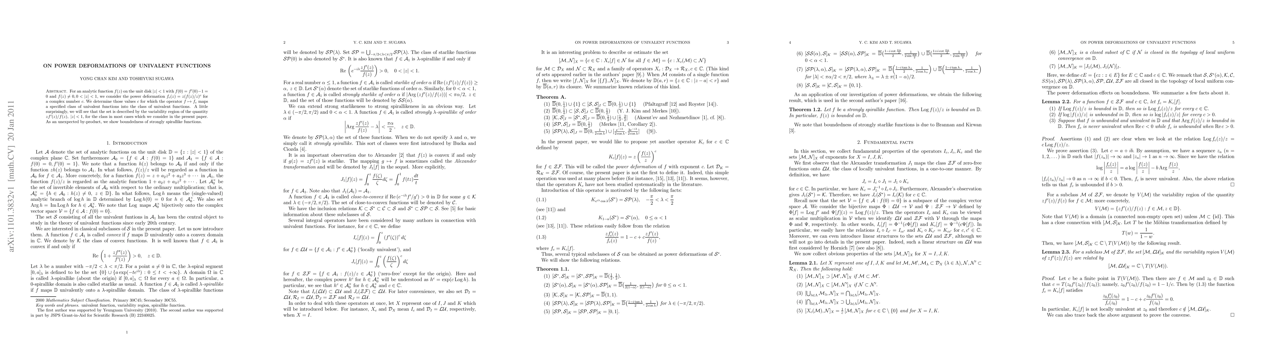 For an analytic function $f(z)$ on the unit disk $|z|<1$ with $f(0)=f'(0)-1=0$ and $f(z)\ne0, 0<|z|<1,$ we consider the power deformation $f_c(z)=z(f(z)/z)^c$ for a complex number $c.$ We determine those values $c$ for which the operator $f\mapsto f_c$ maps a specified class of univalent functions into the class of univalent functions. A little surprisingly, we will see that the set is described by the variability region of the quantity $zf'(z)/f(z),~|z|<1,$ for the class in most cases which we consider in the present paper. As an unexpected by-product, we show boundedness of strongly spirallike functions.