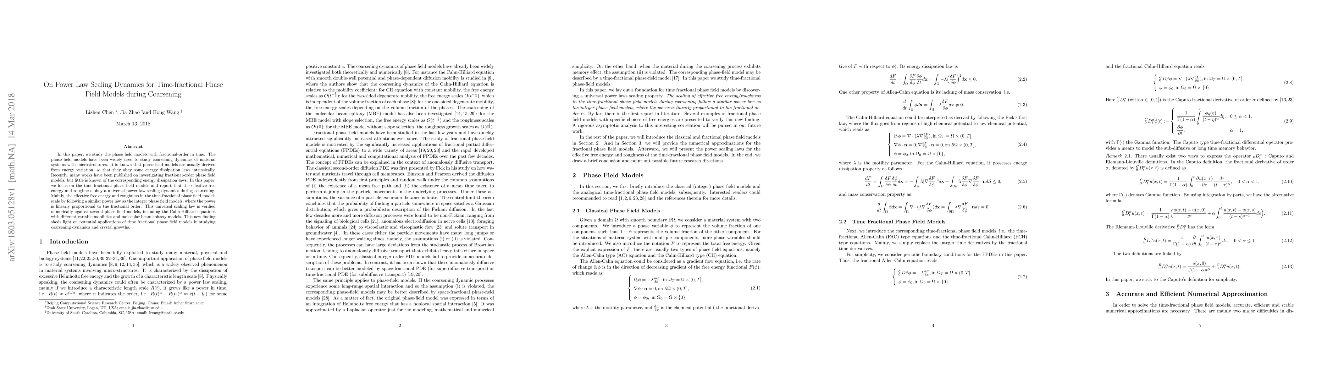 The study of time-fractional phase field models reveals a universal power-law scaling dynamics during coarsening, with the effective free energy and roughness scaling similarly to integer phase field models, depending on the fractional order.