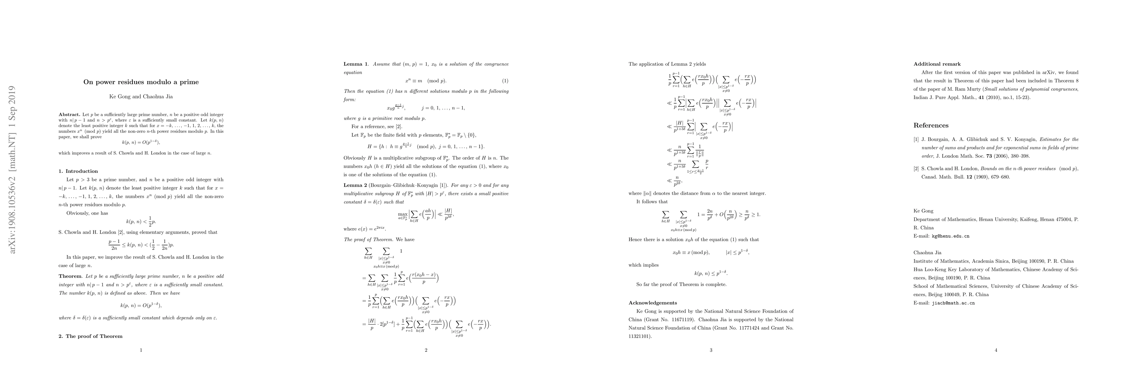 Let $p$ be a sufficiently large prime number, $n$ be a positive odd integer with $n|\,p-1$ and $n>p^\varepsilon $, where $\varepsilon$ is a sufficiently small constant. Let $k(p,\,n)$ denote the least positive integer $k$ such that for $x=-k,\,\dots,\,-1,\,1,\,2,\,\dots,\,k$, the numbers $x^n\pmod p$ yield all the non-zero $n$-th power residues modulo $p$. In this paper, we shall prove $$ k(p,\,n)=O(p^{1-\delta}), $$ which improves a result of S. Chowla and H. London in the case of large $n$.
