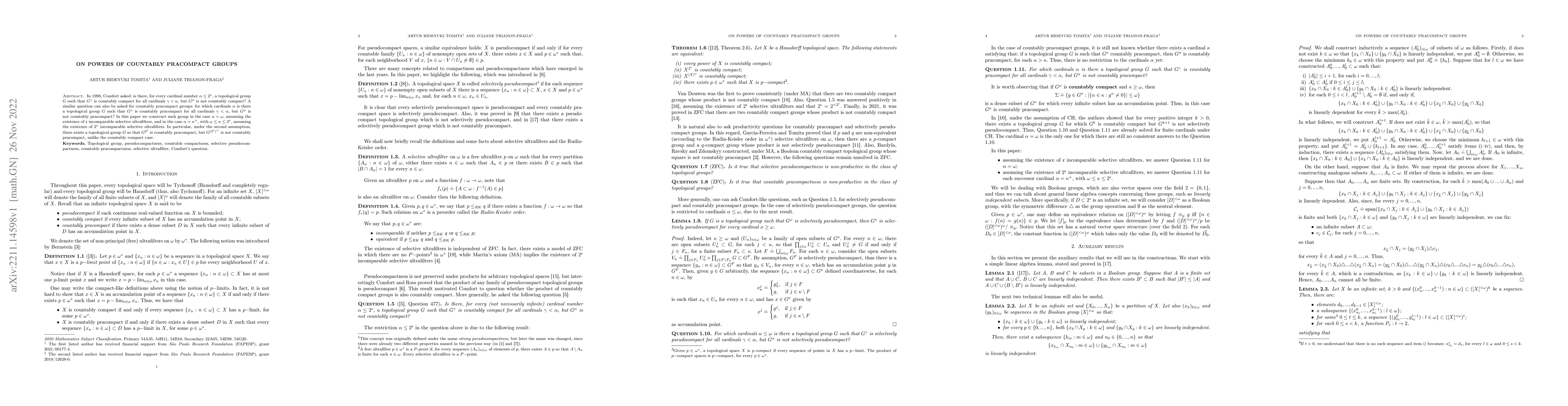 This paper constructs topological groups that exhibit specific countably pracompact properties for certain cardinal powers, addressing a question posed by Comfort regarding the existence of such groups. It provides examples under the assumptions of the existence of specific ultrafilters, notably showing that for $\alpha = \kappa^{+}$, $G^{\alpha}$ fails to be countably pracompact when $\alpha$ exceeds $2^{\mathfrak{c}}$.
