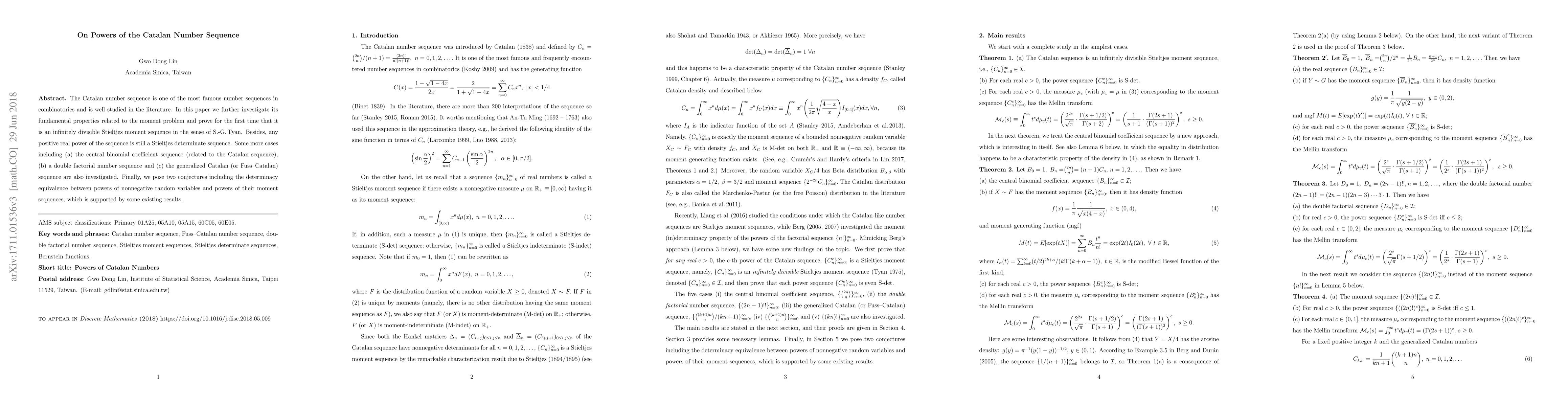 This paper explores the fundamental properties of the Catalan number sequence, proving it is an infinitely divisible Stieltjes moment sequence. It also demonstrates that any positive real power of the Catalan sequence remains a Stieltjes determinate sequence, and extends these findings to related sequences like central binomial coefficients, double factorials, and generalized Catalan numbers. The paper concludes with two conjectures on the determinacy equivalence between powers of random variables and their moment sequences.
