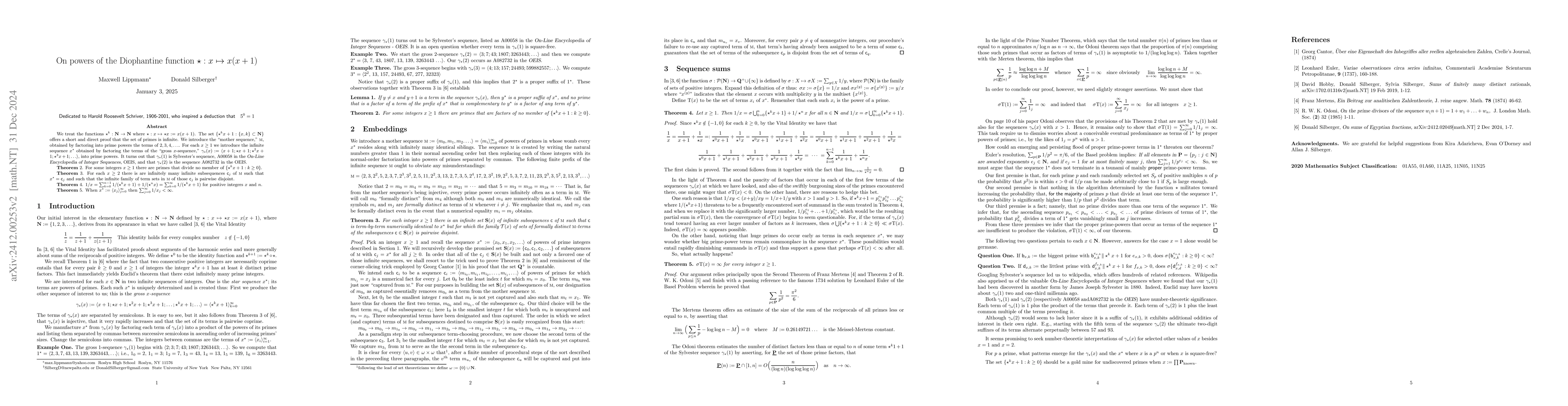 We treat the functions $\star^k:{\mathbf N}\rightarrow{\mathbf N}$ where $\star:x\mapsto \star x := x(x+1)$. The set $\{\star^k x: \{x,k\}\subset{\mathbf N}\}$ offers a short and direct proof that the set of primes is infinite. We introduce the ``mother sequence,'' M, obtained by factoring into prime powers the terms of $2,3,4,\ldots$. For each $x\ge2$ we introduce the infinite sequence $x^\star$ obtained by factoring the terms of the ``gross $x$-sequence,'' $\gamma_\star(x) :=\langle x+1;\star x+1;\star^2x+1;\star^3x+1;\ldots\rangle$, into prime powers. It turns out that $\gamma_\star(1)$ is Sylvester's sequence, A00058 in the On-Line Encyclopedia of Integer Sequences - OEIS, and that $\gamma_\star(2)$ is the sequence A082732 in the OEIS. Theorem 2. For some integers $x\ge1$ there are primes that are factors of no member of $\{\star^kx: k\ge0\}$. Theorem 3. For each $x\ge2$ there is are infinitely many infinite subsequences ${\sf c}_j$ of M such that $x^\star = {\sf c}_j$ and such that the infinite family of term sets in M of those ${\sf c}_j$ is pairwise disjoint.