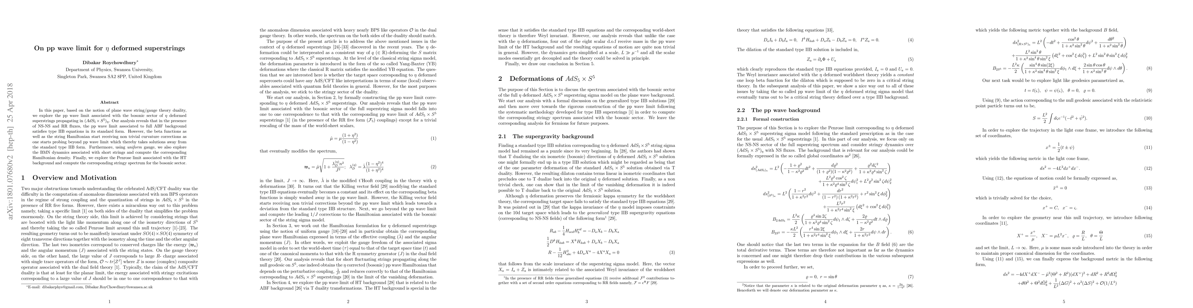 In this paper, based on the notion of plane wave string/gauge theory duality, we explore the pp wave limit associated with the bosonic sector of $ \eta $ deformed superstrings propagating in $ (AdS_5 \times S^{5})_{\eta} $. Our analysis reveals that in the presence of NS-NS and RR fluxes, the pp wave limit associated to full ABF background satisfies type IIB equations in its standard form. However, the beta functions as well as the string Hamiltonian start receiving non trivial curvature corrections as one starts probing beyond pp wave limit which thereby takes solutions away from the standard type IIB form. Furthermore, using \textit{uniform} gauge, we also explore the BMN dynamics associated with short strings and compute the corresponding Hamiltonian density. Finally, we explore the Penrose limit associated with the HT background and compute the corresponding stringy spectrum for the bosonic sector.
