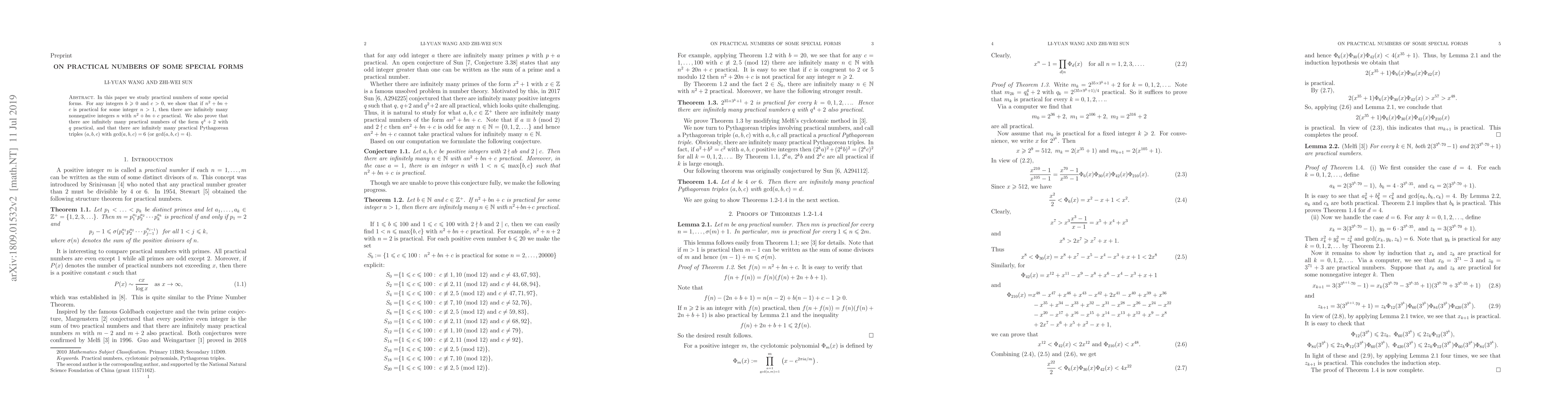 This paper investigates practical numbers of specific forms, proving that if $n^2+bn+c$ is practical for some integer $n>1$, then there are infinitely many such practical numbers. It also demonstrates the existence of infinitely many practical numbers of the form $q^4+2$ and practical Pythagorean triples with gcd 6 or 4.