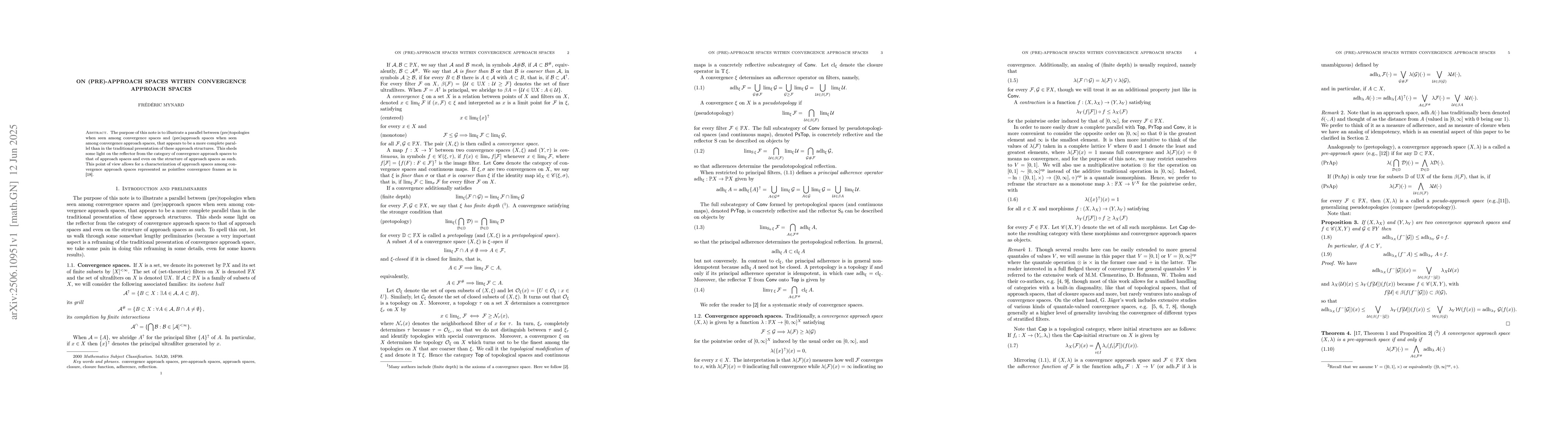 The purpose of this note is to illustrate a parallel between (pre)topologies when seen among convergence spaces and (pre)approach spaces when seen among convergence approach spaces, that appears to be a more complete parallel than in the traditional presentation of these approach structures. This sheds some light on the reflector from the category of convergence approach spaces to that of approach spaces and even on the structure of approach spaces as such. This point of view allows for a characterization of approach spaces among convergence approach spaces represented as pointfree convergence frames as in [18].