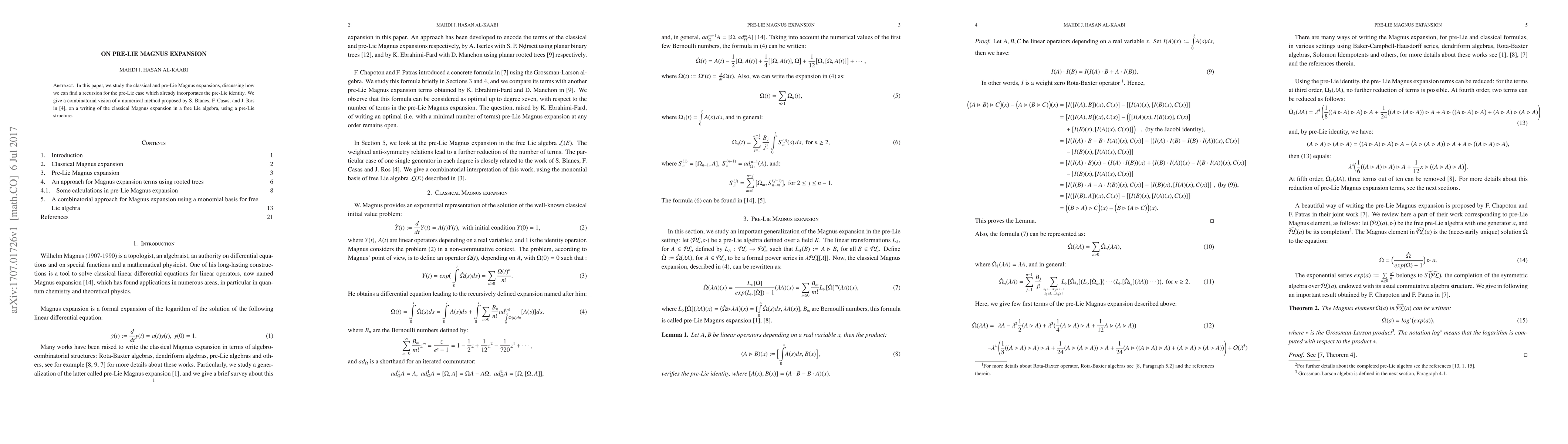 This paper explores the classical and pre-Lie Magnus expansions, focusing on deriving a recursion for the pre-Lie case that inherently includes the pre-Lie identity. It also presents a combinatorial approach to a numerical method for the classical Magnus expansion using a pre-Lie structure.