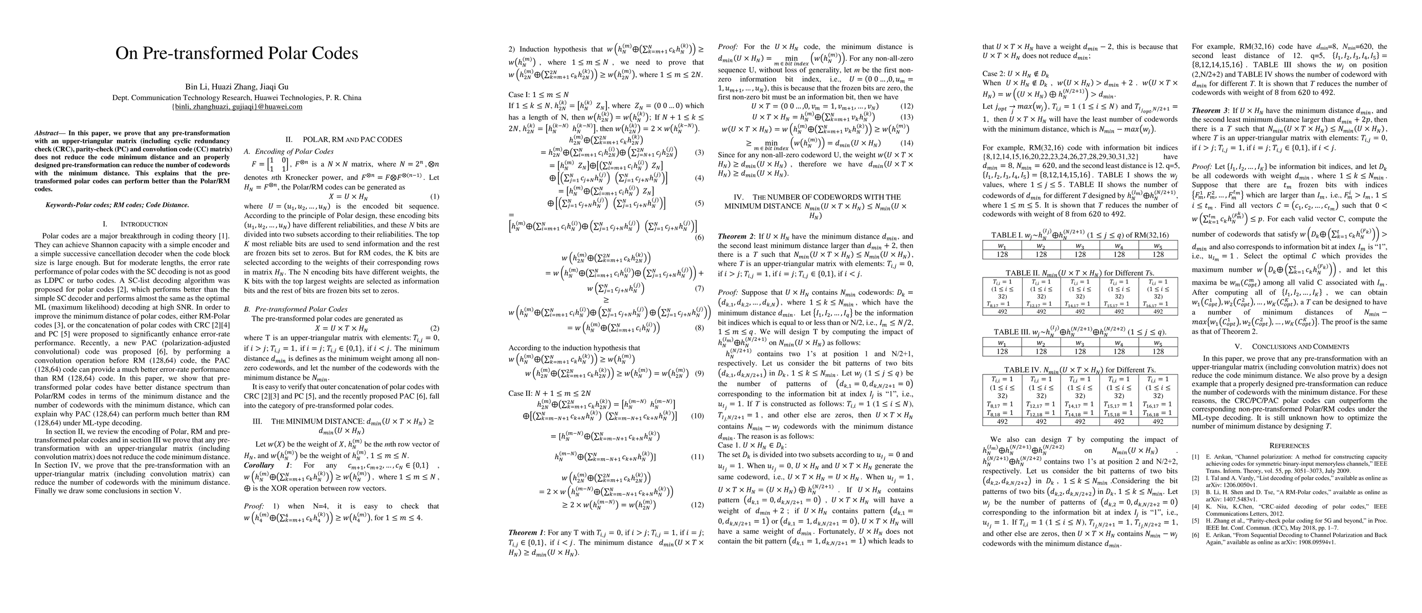 Summary: This paper demonstrates that pre-transformations using upper-triangular matrices do not decrease the minimum distance of polar codes and can effectively reduce the number of minimum distance codewords, thereby potentially outperforming Polar/RM codes.