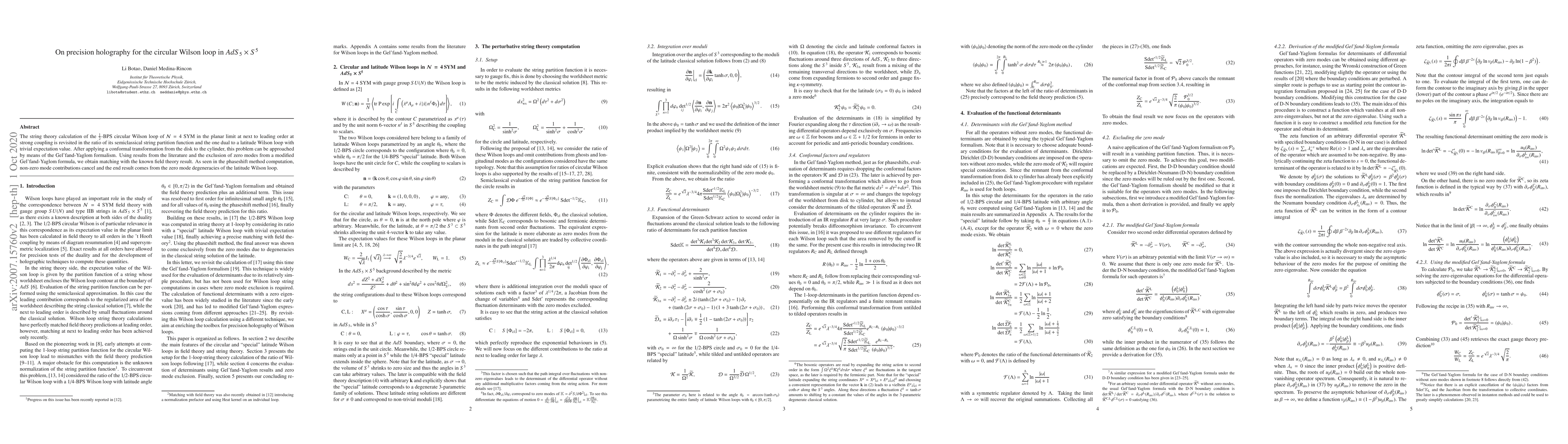 This paper revisits the calculation of the 1/2-BPS circular Wilson loop in N=4 SYM using string theory, focusing on the ratio of its semiclassical string partition function to a dual latitude Wilson loop. The Gel'fand-Yaglom formalism is applied after a conformal transformation, leading to matching with known field theory results, where non-zero mode contributions cancel and the result depends on zero mode degeneracies.