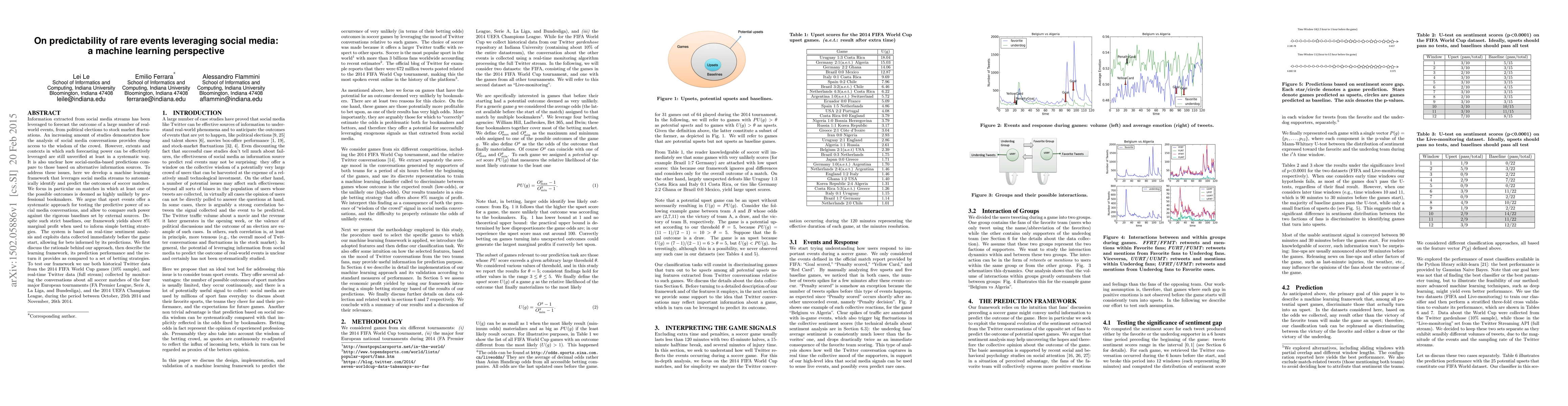 Information extracted from social media streams has been leveraged to forecast the outcome of a large number of real-world events, from political elections to stock market fluctuations. An increasing amount of studies demonstrates how the analysis of social media conversations provides cheap access to the wisdom of the crowd. However, extents and contexts in which such forecasting power can be effectively leveraged are still unverified at least in a systematic way. It is also unclear how social-media-based predictions compare to those based on alternative information sources. To address these issues, here we develop a machine learning framework that leverages social media streams to automatically identify and predict the outcomes of soccer matches. We focus in particular on matches in which at least one of the possible outcomes is deemed as highly unlikely by professional bookmakers. We argue that sport events offer a systematic approach for testing the predictive power of social media, and allow to compare such power against the rigorous baselines set by external sources. Despite such strict baselines, our framework yields above 8% marginal profit when used to inform simple betting strategies. The system is based on real-time sentiment analysis and exploits data collected immediately before the games, allowing for informed bets. We discuss the rationale behind our approach, describe the learning framework, its prediction performance and the return it provides as compared to a set of betting strategies. To test our framework we use both historical Twitter data from the 2014 FIFA World Cup games, and real-time Twitter data collected by monitoring the conversations about all soccer matches of four major European tournaments (FA Premier League, Serie A, La Liga, and Bundesliga), and the 2014 UEFA Champions League, during the period between Oct. 25th 2014 and Nov. 26th 2014.
