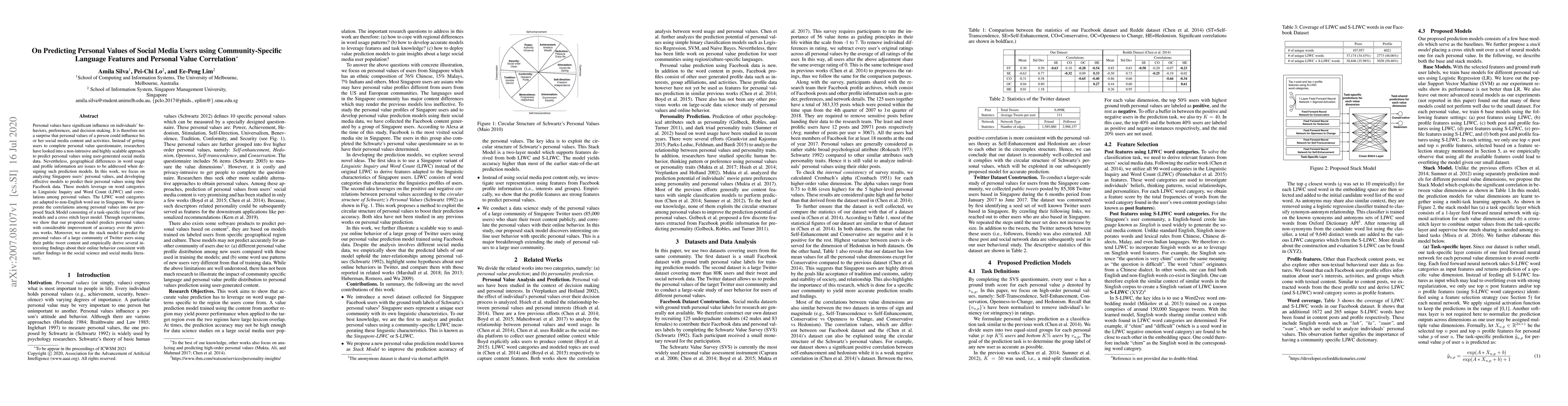 This paper develops models to predict the personal values of Singapore Facebook users using non-intrusive social media data, adapting linguistic features and incorporating value correlations. The proposed Stack Model shows improved accuracy compared to previous methods and extends findings to Twitter users, revealing insights into online behavior.