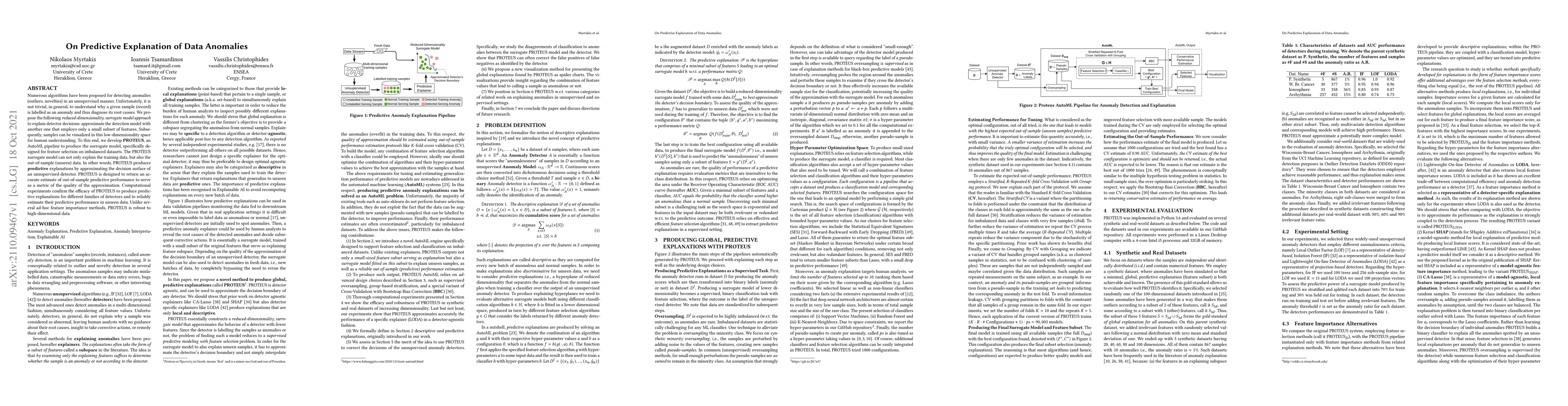 Numerous algorithms have been proposed for detecting anomalies (outliers, novelties) in an unsupervised manner. Unfortunately, it is not trivial, in general, to understand why a given sample (record) is labelled as an anomaly and thus diagnose its root causes. We propose the following reduced-dimensionality, surrogate model approach to explain detector decisions: approximate the detection model with another one that employs only a small subset of features. Subsequently, samples can be visualized in this low-dimensionality space for human understanding. To this end, we develop PROTEUS, an AutoML pipeline to produce the surrogate model, specifically designed for feature selection on imbalanced datasets. The PROTEUS surrogate model can not only explain the training data, but also the out-of-sample (unseen) data. In other words, PROTEUS produces predictive explanations by approximating the decision surface of an unsupervised detector. PROTEUS is designed to return an accurate estimate of out-of-sample predictive performance to serve as a metric of the quality of the approximation. Computational experiments confirm the efficacy of PROTEUS to produce predictive explanations for different families of detectors and to reliably estimate their predictive performance in unseen data. Unlike several ad-hoc feature importance methods, PROTEUS is robust to high-dimensional data.