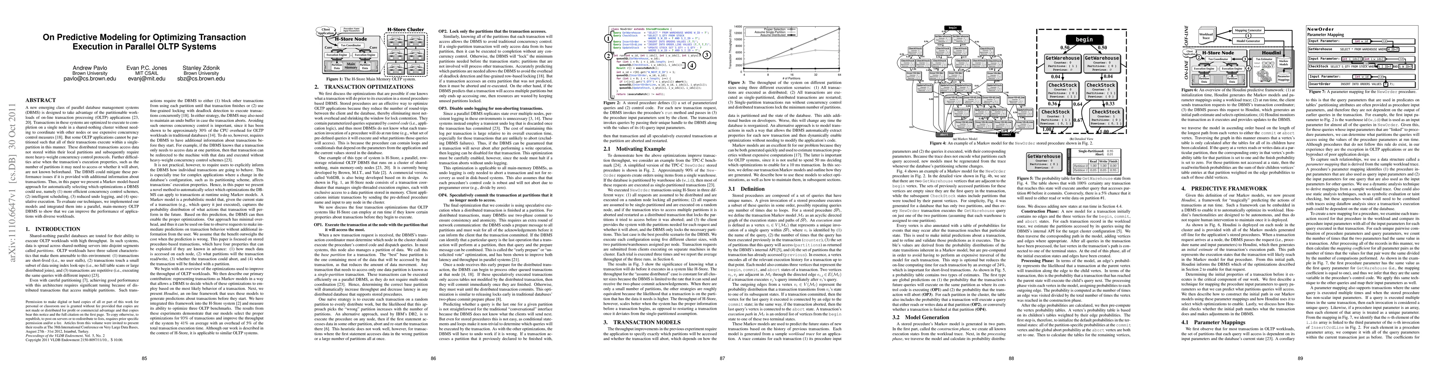 This paper proposes a Markov model-based predictive approach to optimize transaction execution in parallel OLTP systems by selecting appropriate optimizations like efficient concurrency control, intelligent scheduling, reduced undo logging, and speculative execution to enhance performance. The method was implemented and tested in a parallel OLTP DBMS, demonstrating improved performance across diverse workloads.