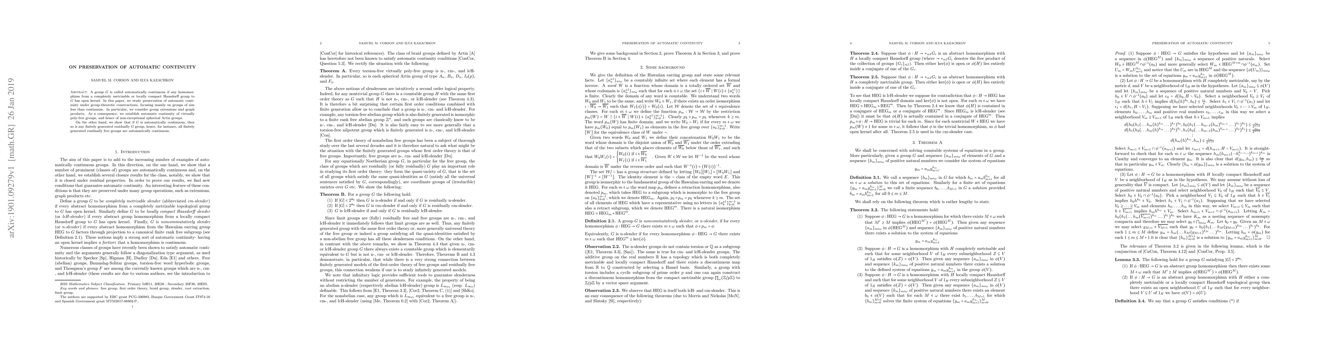 This paper investigates the preservation of automatic continuity in group-theoretic constructions, particularly in groups of size less than the continuum. It establishes automatic continuity for virtually poly-free groups and non-exceptional spherical Artin groups, and shows that any finitely generated residually $G$ group is automatically continuous if $G$ is automatically continuous.