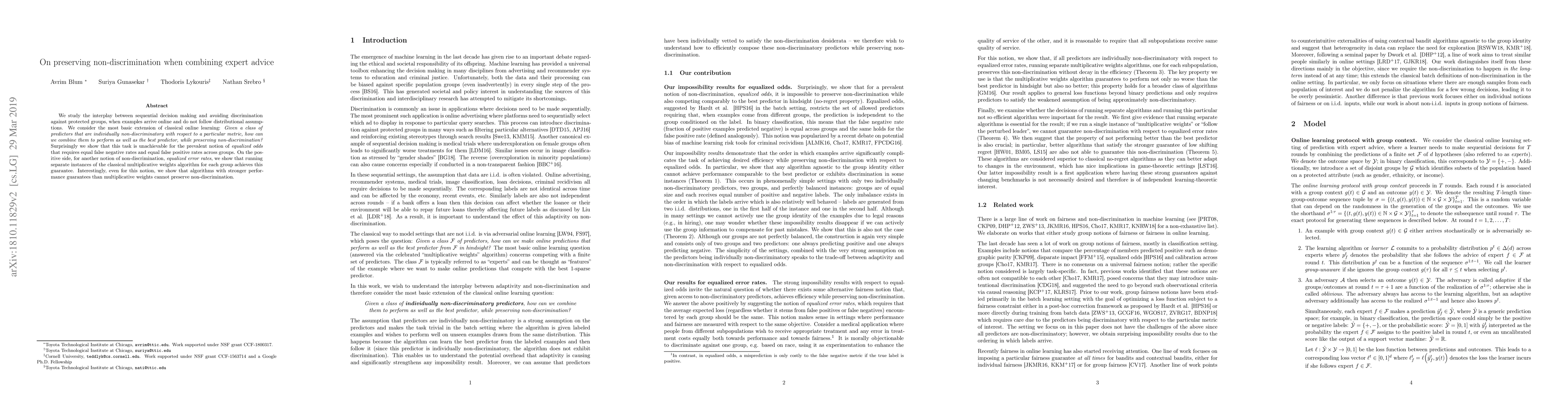 Researchers found that combining expert advice to avoid discrimination against protected groups is challenging, especially when using the 'equalized odds' approach, but separate algorithms for each group can achieve 'equalized error rates'.