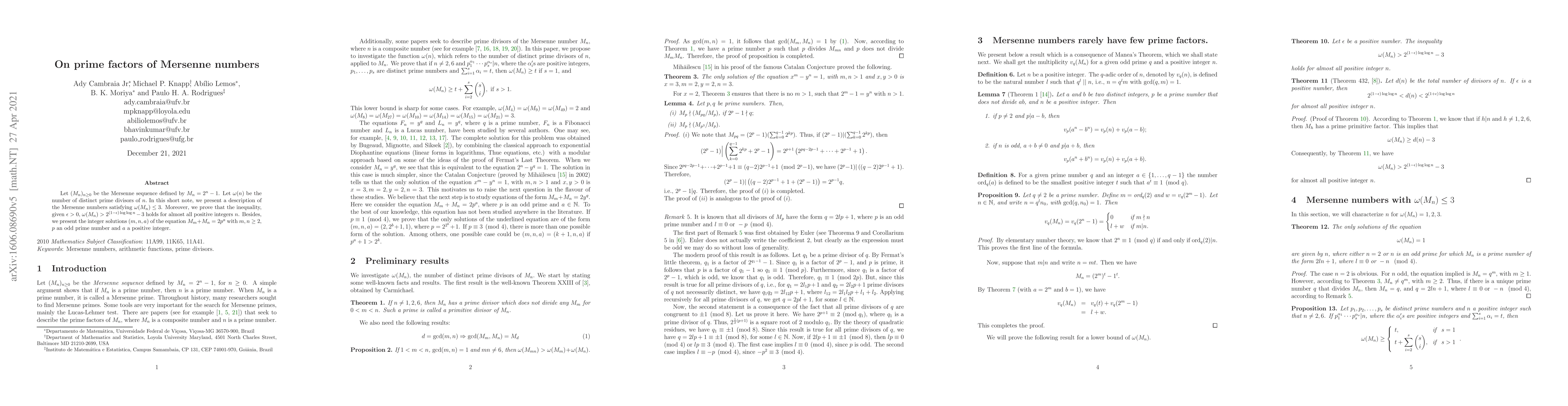 This paper explores Mersenne numbers, proving that almost all have more than 2 distinct prime factors except for those with at most 3, and providing solutions to a related equation involving primes and integers.
