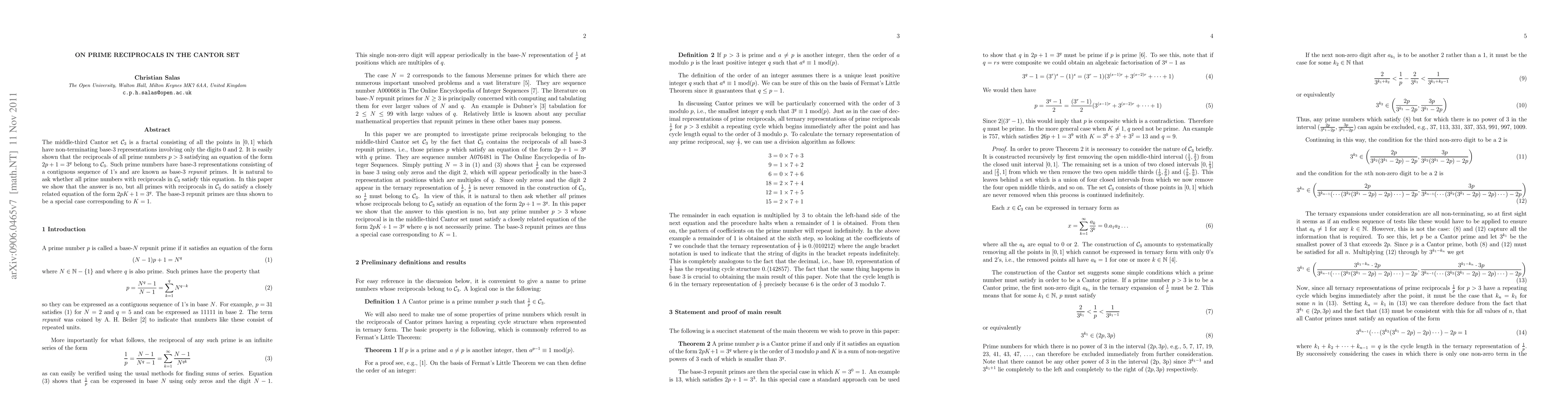 The middle-third Cantor set C_3 is a fractal consisting of all the points in [0, 1] which have non-terminating base-3 representations involving only the digits 0 and 2. It is easily shown that the reciprocals of all prime numbers p > 3 satisfying an equation of the form 2p + 1 = 3^q belong to C_3. Such prime numbers have base-3 representations consisting of a contiguous sequence of 1's and are known as base-3 repunit primes. It is natural to ask whether all prime numbers with reciprocals in C_3 satisfy this equation. In this paper we show that the answer is no, but all primes with reciprocals in C_3 do satisfy a closely related equation of the form 2pK + 1 = 3^q. The base-3 repunit primes are thus shown to be a special case corresponding to K = 1.