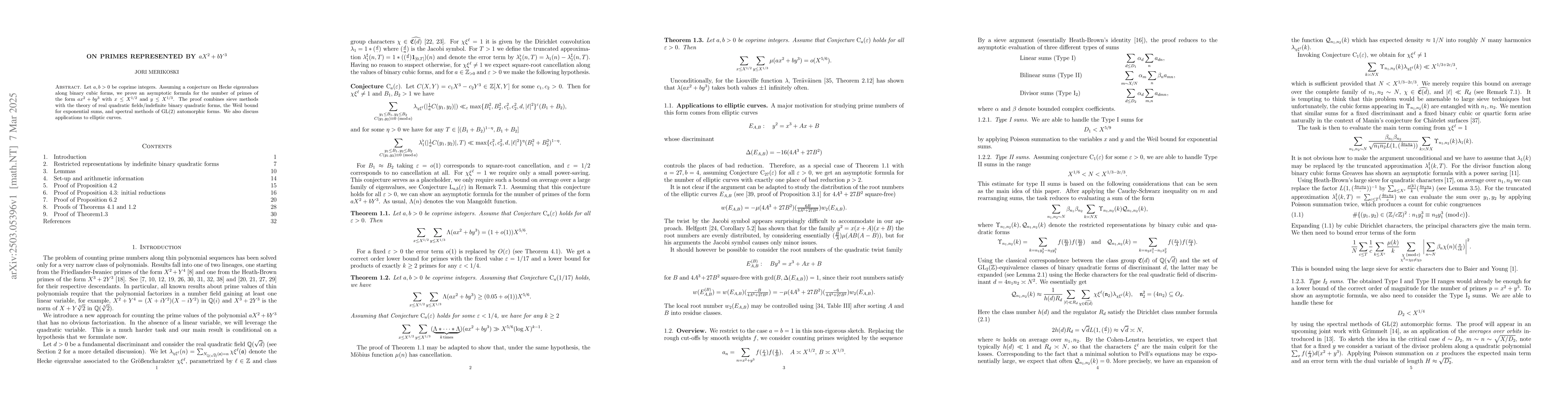This paper proves an asymptotic formula for the number of primes of the form $ax^2+by^3$ under certain conditions, using a combination of sieve methods, real quadratic fields, the Weil bound, and spectral methods of GL(2) automorphic forms, assuming a conjecture on Hecke eigenvalues for binary cubic forms. Applications to elliptic curves are also discussed.