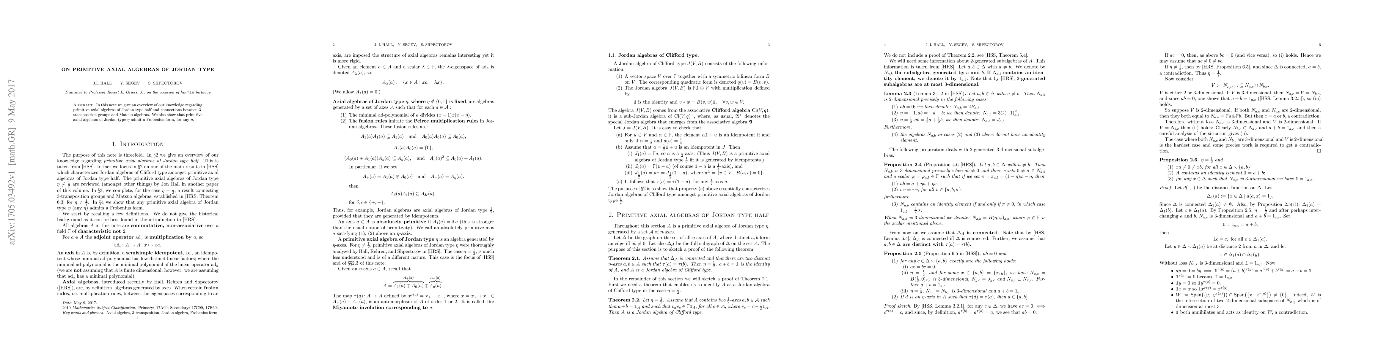 In this note we give an overview of our knowledge regarding primitive axial algebras of Jordan type half and connections between $3$-transposition groups and Matsuo algebras. We also show that primitive axial algebras of Jordan type $\eta$ admit a Frobenius form, for any $\eta$.