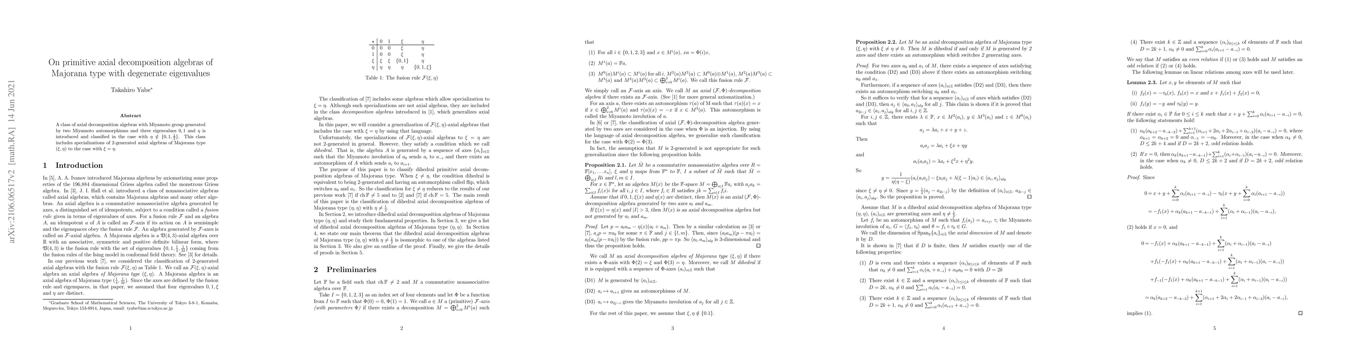 Summary: This paper introduces and classifies axial decomposition algebras of Majorana type with degenerate eigenvalues, focusing on algebras generated by two Miyamoto automorphisms and three specific eigenvalues. The classification is detailed for cases where the third eigenvalue is not zero, one, or half.