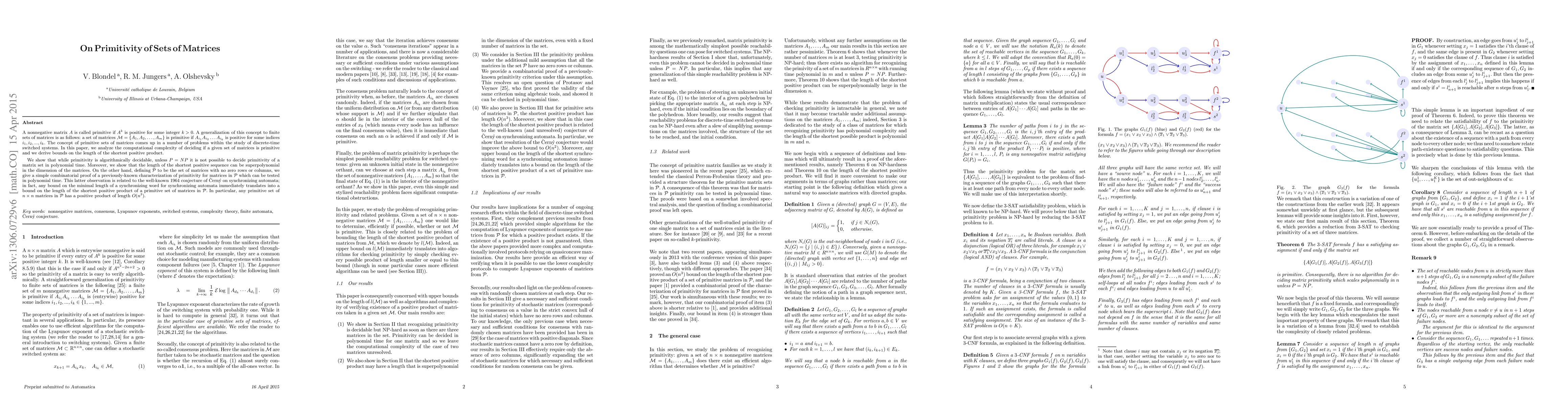 This paper explores the primitivity of sets of matrices, defining primitivity as the existence of a positive product among matrix combinations. It establishes that while primitivity is decidable, it is NP-hard to determine in polynomial time, and the shortest positive product length can be superpolynomial. However, for matrices without zero rows or columns, a polynomial-time test for primitivity is provided, linking to the Cerny conjecture on synchronizing automata.