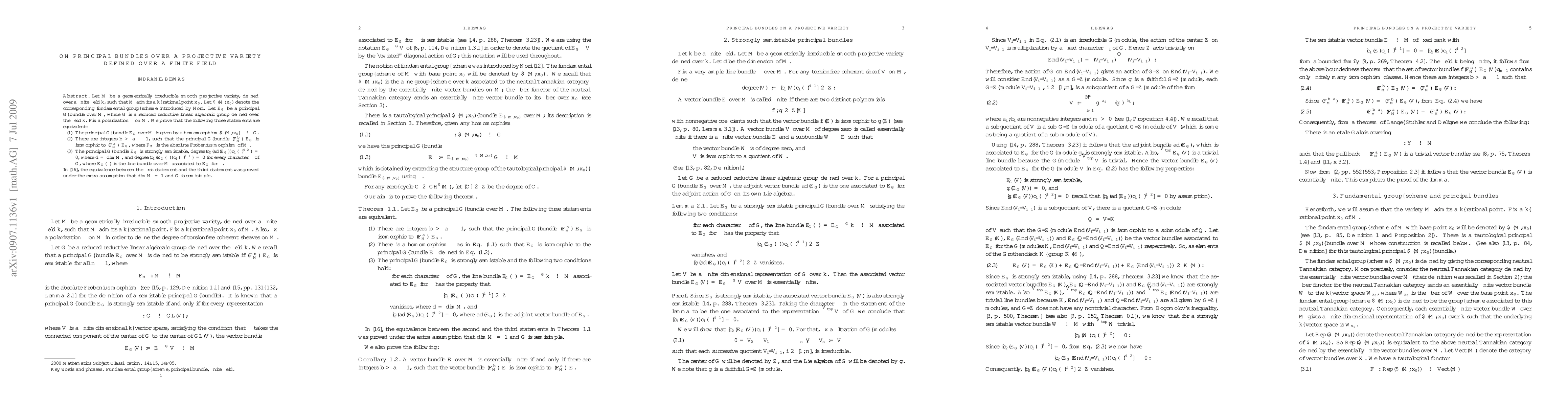 Let M be a geometrically irreducible smooth projective variety, defined over a finite field k, such that M admits a k-rational point x_0. Let \varpi(M,x_0) denote the corresponding fundamental group--scheme introduced by Nori. Let E_G be a principal G-bundle over M, where G is a reduced reductive linear algebraic group defined over the field k. Fix a polarization \xi on M. We prove that the following three statements are equivalent: The principal G-bundle E_G over M is given by a homomorphism \varpi(M,x_0) --> G. There are integers b > a > 0 such that the principal G-bundle (F^b_M)^*E_G is isomorphic to (F^a_M)^*E_G, where F_M is the absolute Frobenius morphism of M. The principal G-bundle E_G is strongly semistable, degree(c_2(ad(E_G))c_1(\xi)^{d-2}) = 0, where d = \dim M, and degree(c_1(E_G(\chi))c_1(\xi)^{d-1}) = 0 for every character \chi of G, where E_G(\chi) is the line bundle over $M$ associated to $E_G$ for \chi. The equivalence between the first statement and the third statement was proved by S. Subramanian under the extra assumption that dim(M) = 1 and $G$ is semisimple.
