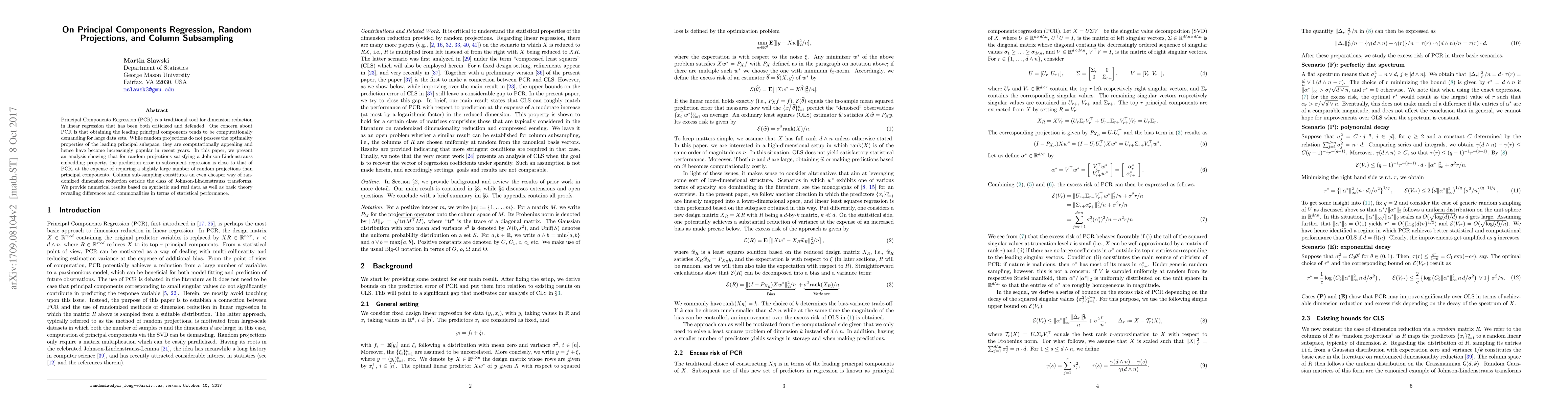 This paper compares Principal Components Regression (PCR) with random projections and column subsampling for dimension reduction in linear regression. It finds that random projections, while less optimal, are computationally efficient and nearly as effective as PCR, whereas column subsampling offers an even cheaper alternative with varying performance.