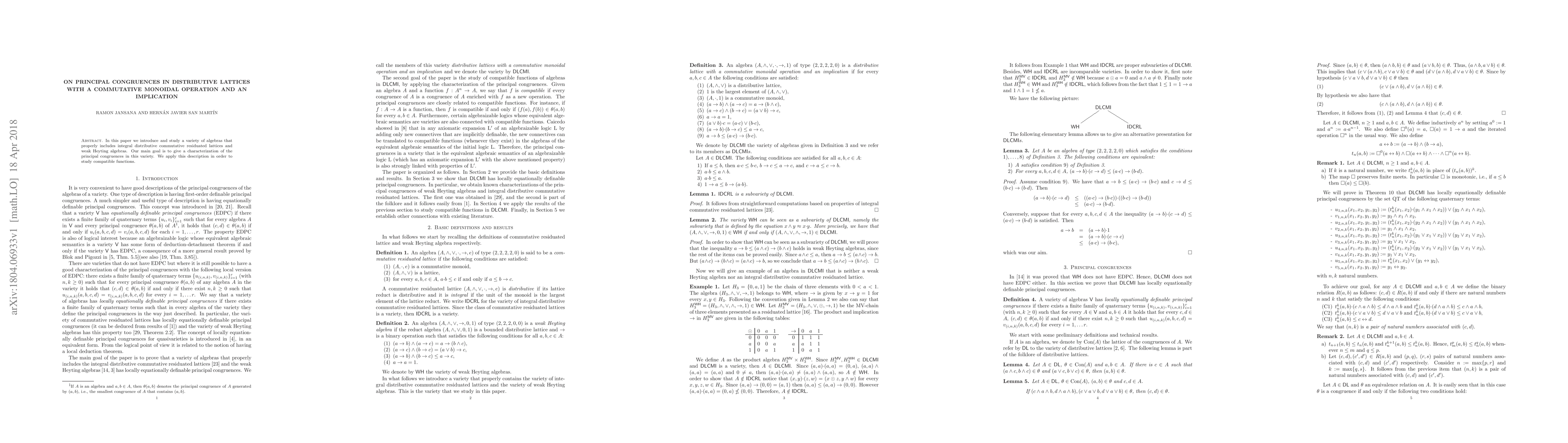 In this paper we introduce and study a variety of algebras that properly includes integral distributive commutative residuated lattices and weak Heyting algebras. Our main goal is to give a characterization of the principal congruences in this variety. We apply this description in order to study compatible functions.