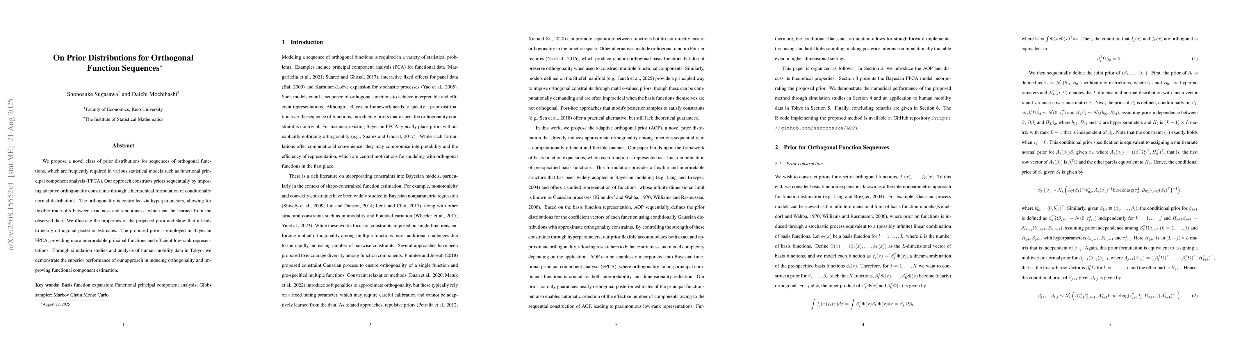 We propose a novel class of prior distributions for sequences of orthogonal functions, which are frequently required in various statistical models such as functional principal component analysis (FPCA). Our approach constructs priors sequentially by imposing adaptive orthogonality constraints through a hierarchical formulation of conditionally normal distributions. The orthogonality is controlled via hyperparameters, allowing for flexible trade-offs between exactness and smoothness, which can be learned from the observed data. We illustrate the properties of the proposed prior and show that it leads to nearly orthogonal posterior estimates. The proposed prior is employed in Bayesian FPCA, providing more interpretable principal functions and efficient low-rank representations. Through simulation studies and analysis of human mobility data in Tokyo, we demonstrate the superior performance of our approach in inducing orthogonality and improving functional component estimation.
