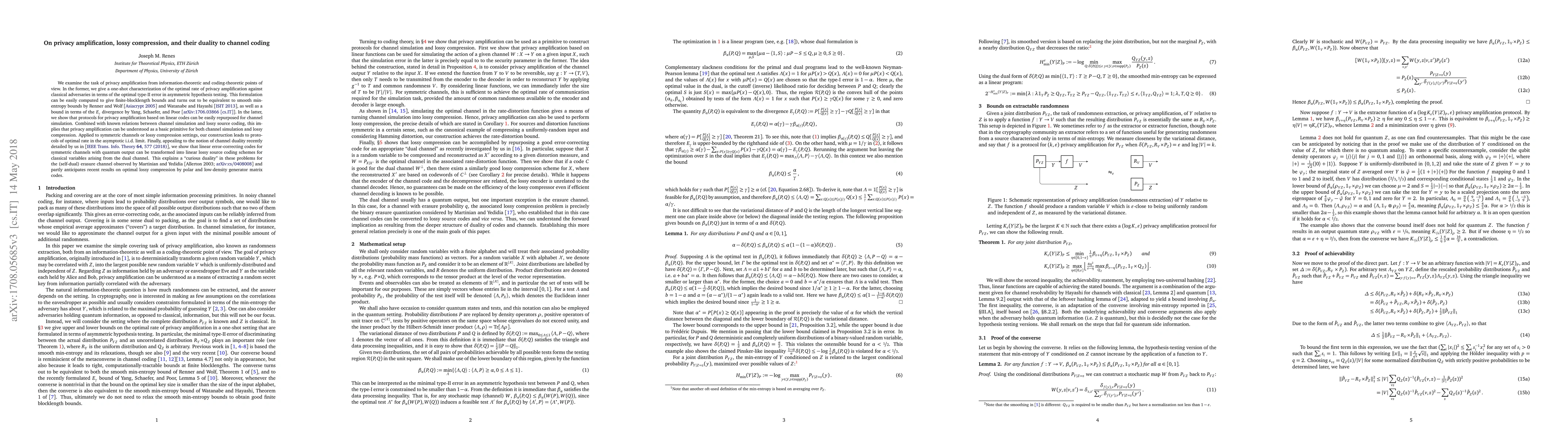 This paper explores the information-theoretic and coding-theoretic aspects of privacy amplification, showing its equivalence to smooth min-entropy bounds and its role in channel simulation and lossy compression. It also reveals a duality between linear error-correcting codes and lossy source coding schemes through channel duality.
