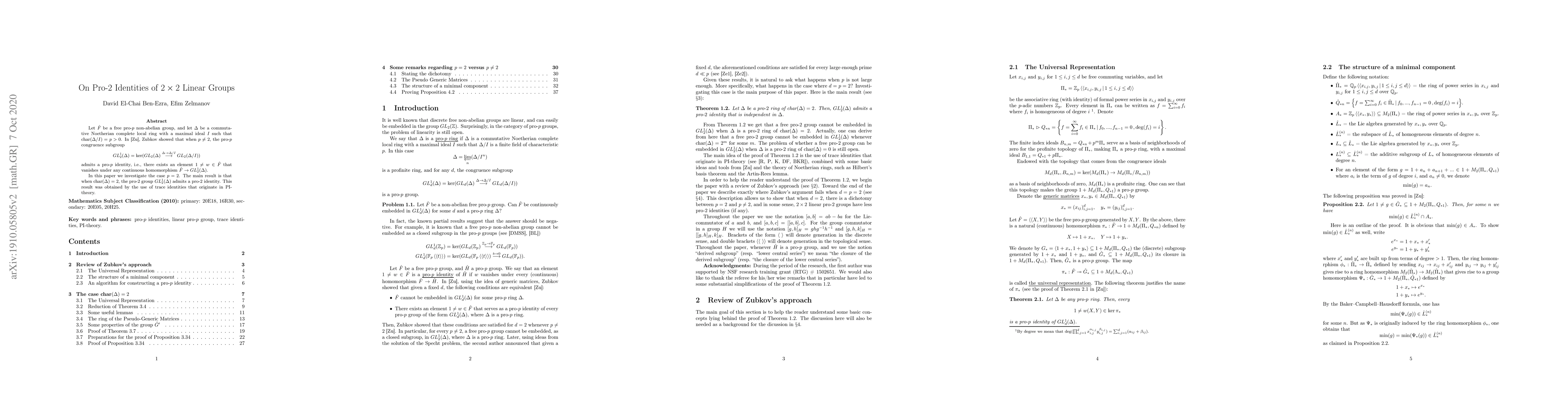 Let $\hat{F}$ be a free pro-$p$ non-abelian group, and let $\Delta$ be a commutative Noetherian complete local ring with a maximal ideal $I$ such that $\textrm{char}(\Delta/I)=p>0$. In [Zu], Zubkov showed that when $p\neq2$, the pro-$p$ congruence subgroup $$GL_{2}^{1}(\Delta)=\ker(GL_{2}(\Delta)\overset{\Delta\to\Delta/I}{\longrightarrow}GL_{2}(\Delta/I))$$ admits a pro-$p$ identity, i.e., there exists an element $1\neq w\in\hat{F}$ that vanishes under any continuous homomorphism $\hat{F}\to GL_{2}^{1}(\Delta)$. In this paper we investigate the case $p=2$. The main result is that when $\textrm{char}(\Delta)=2$, the pro-$2$ group $GL_{2}^{1}(\Delta)$ admits a pro-$2$ identity. This result was obtained by the use of trace identities that originate in PI-theory.