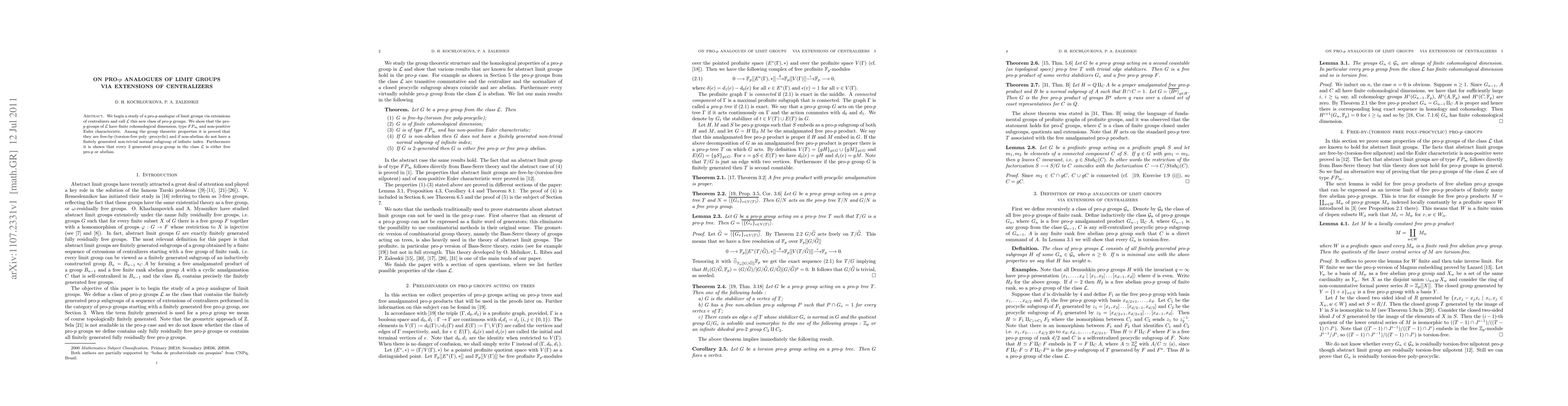 We begin a study of a pro-$p$ analogue of limit groups via extensions of centralizers and call $\mathcal{L}$ this new class of pro-$p$ groups. We show that the pro-$p$ groups of $\mathcal{L}$ have finite cohomological dimension, type $FP_{\infty}$ and non-positive Euler characteristic. Among the group theoretic properties it is proved that they are free-by-(torsion-free poly -procyclic) and if non-abelian do not have a finitely generated non-trivial normal subgroup of infinite index. Furthermore it is shown that every 2 generated pro-$p$ group in the class $\mathcal{L}$ is either free pro-$p$ or abelian.