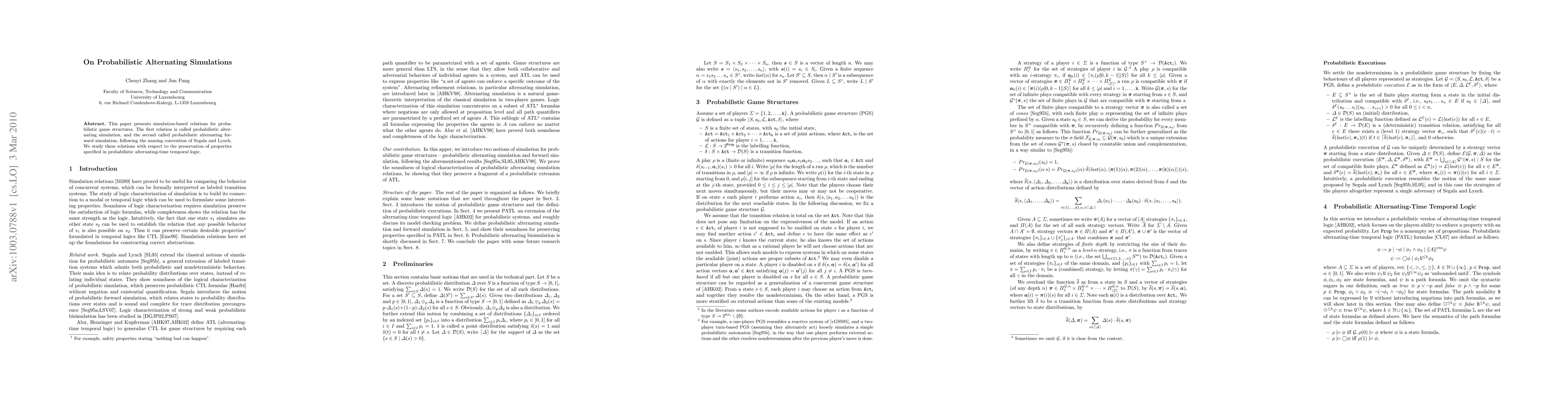 This paper presents simulation-based relations for probabilistic game structures. The first relation is called probabilistic alternating simulation, and the second called probabilistic alternating forward simulation, following the naming convention of Segala and Lynch. We study these relations with respect to the preservation of properties specified in probabilistic alternating-time temporal logic.