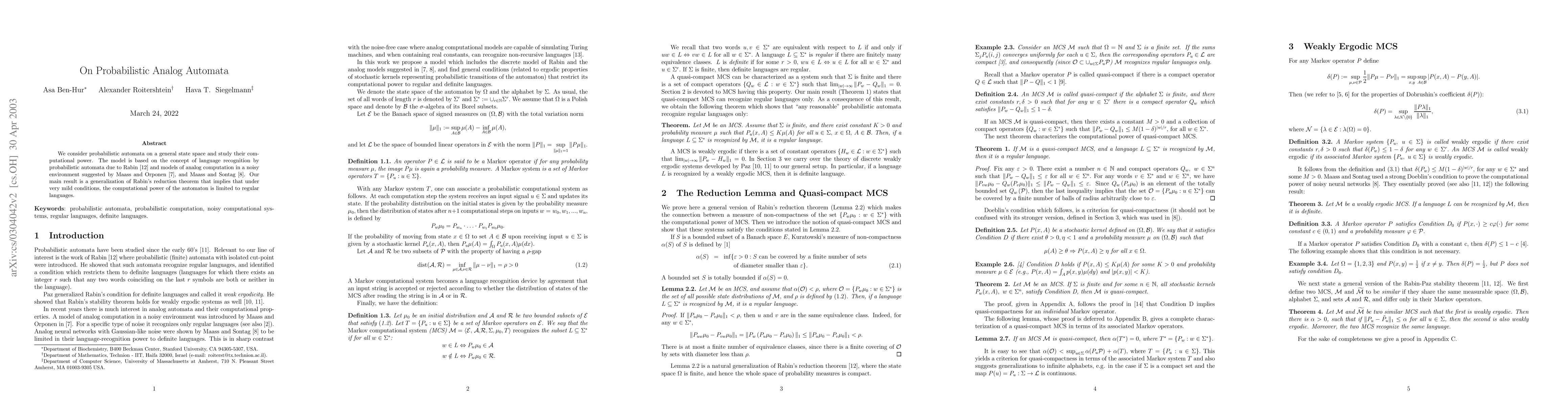 Researchers studied probabilistic automata, finding that under mild conditions, their computational power is limited to regular languages. This generalization of Rabin's reduction theorem has implications for the understanding of analog computation in noisy environments.