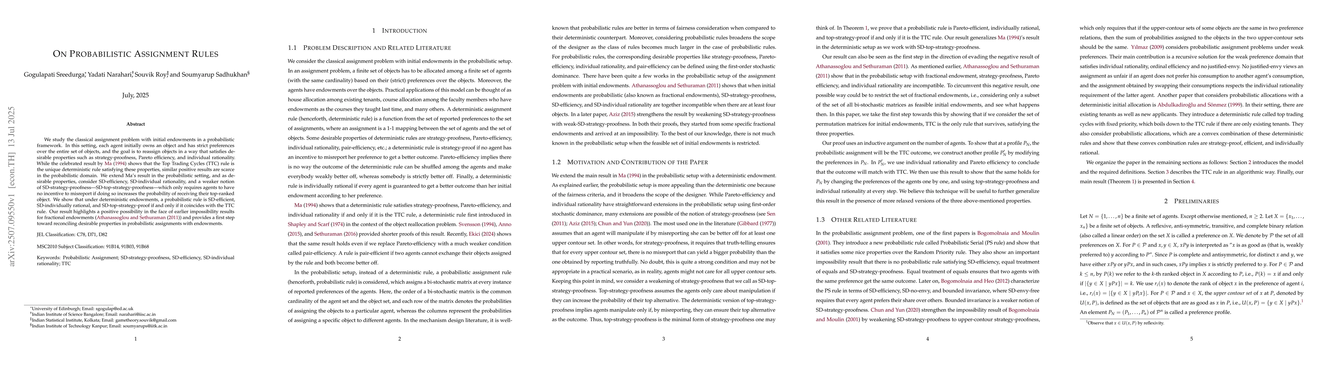 We study the classical assignment problem with initial endowments in a probabilistic framework. In this setting, each agent initially owns an object and has strict preferences over the entire set of objects, and the goal is to reassign objects in a way that satisfies desirable properties such as strategy-proofness, Pareto efficiency, and individual rationality. While the celebrated result by Ma (1994) shows that the Top Trading Cycles (TTC) rule is the unique deterministic rule satisfying these properties, similar positive results are scarce in the probabilistic domain. We extend Ma's result in the probabilistic setting, and as desirable properties, consider SD-efficiency, SD-individual rationality, and a weaker notion of SD-strategy-proofness -- SD-top-strategy-proofness -- which only requires agents to have no incentive to misreport if doing so increases the probability of receiving their top-ranked object. We show that under deterministic endowments, a probabilistic rule is SD-efficient, SD-individually rational, and SD-top-strategy-proof if and only if it coincides with the TTC rule. Our result highlights a positive possibility in the face of earlier impossibility results for fractional endowments (Athanassoglou and Sethuraman (2011)) and provides a first step toward reconciling desirable properties in probabilistic assignments with endowments.