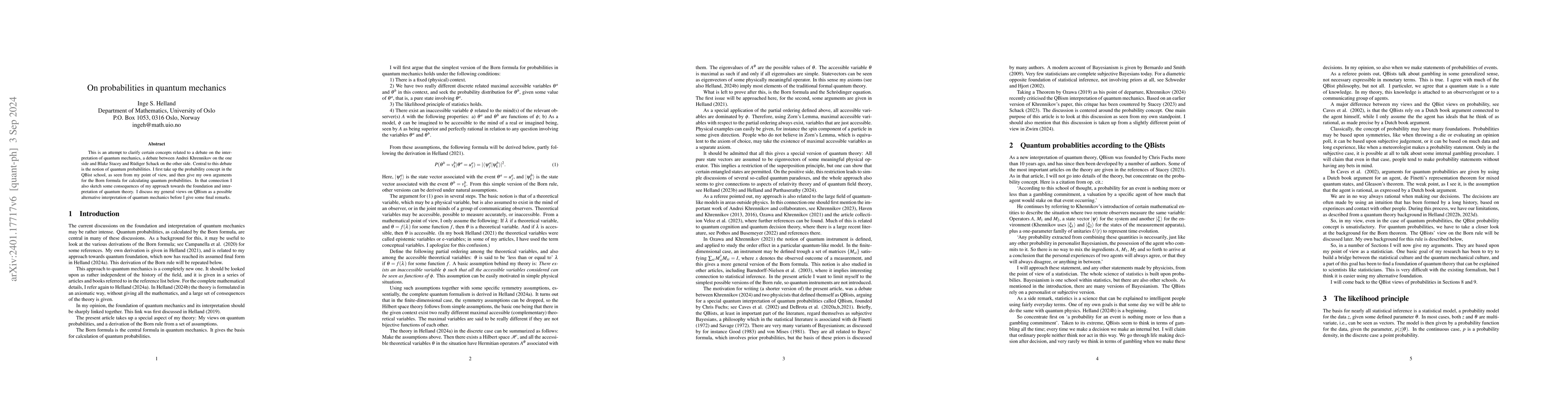 This is an attempt to clarify certain concepts related to a debate on the interpretation of quantum mechanics, a debate between Andrei Khrennikov on the one side and Blake Stacey and R\"udiger Schack on the other side. Central to this debate is the notion of quantum probabilities. I first take up the probability concept in the QBist school, and then give my own arguments for the Born formula for calculating quantum probabilities. In that connection I also sketch some consequences of my approach towards the foundation and interpretation of quantum theory. I discuss my general views on QBism as a possible alternative interpretation before I give some final remarks.