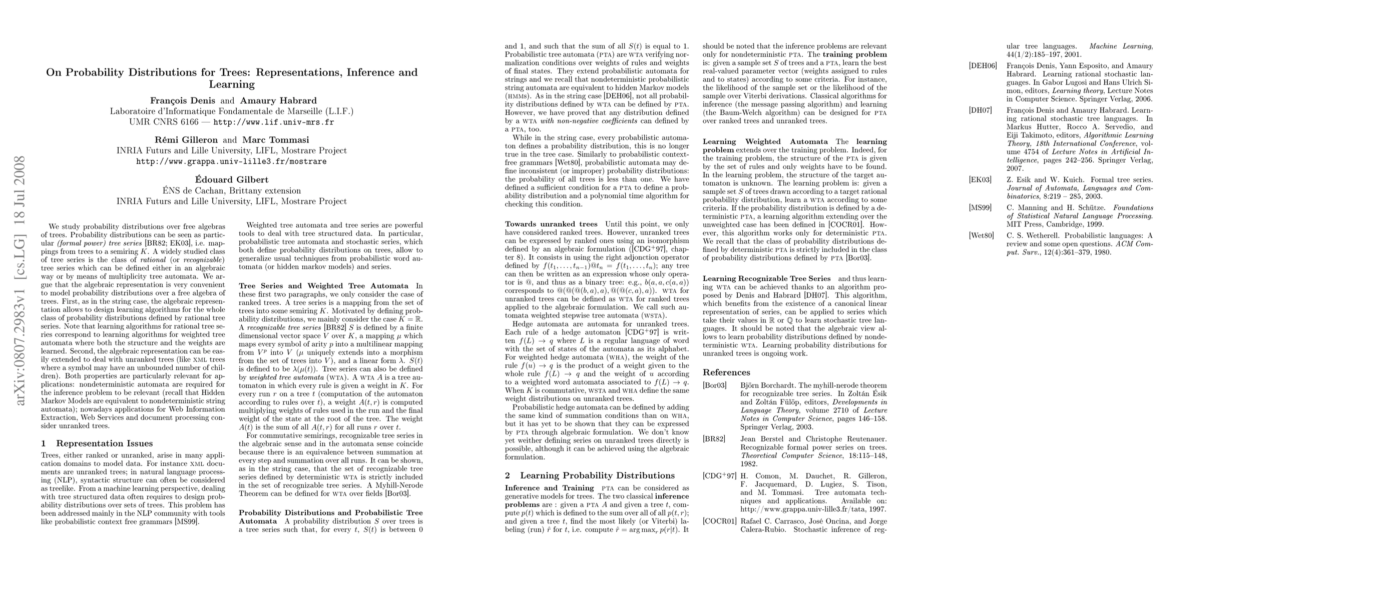 This paper explores probability distributions over free algebras of trees, representing them as rational tree series. It emphasizes the utility of algebraic representations for designing learning algorithms and extending the approach to unranked trees, which are crucial for modern applications in web information extraction and document processing.