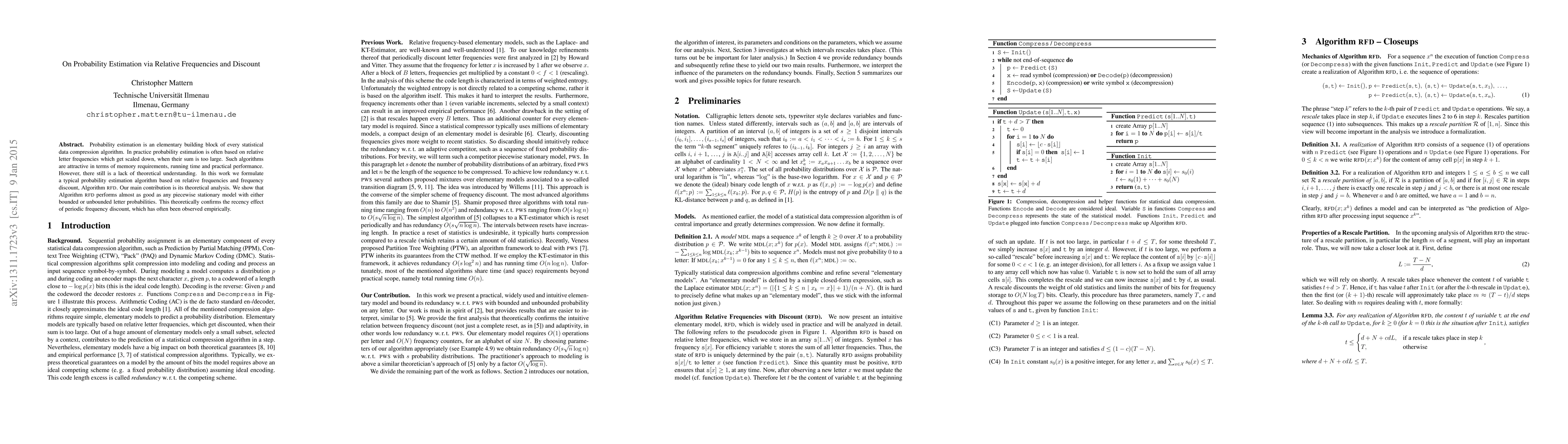 Probability estimation is an elementary building block of every statistical data compression algorithm. In practice probability estimation is often based on relative letter frequencies which get scaled down, when their sum is too large. Such algorithms are attractive in terms of memory requirements, running time and practical performance. However, there still is a lack of theoretical understanding. In this work we formulate a typical probability estimation algorithm based on relative frequencies and frequency discount, Algorithm RFD. Our main contribution is its theoretical analysis. We show that the code length it requires above an arbitrary piecewise stationary model with bounded and unbounded letter probabilities is small. This theoretically confirms the recency effect of periodic frequency discount, which has often been observed empirically.