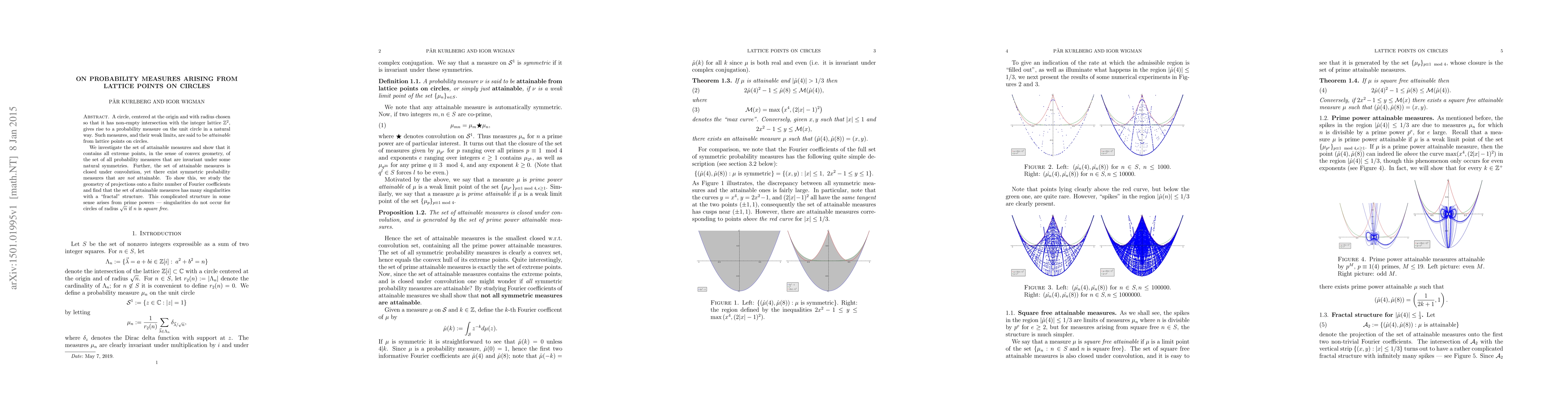 This research paper investigates probability measures arising from lattice points on circles, showing that attainable measures contain extreme points of invariant symmetries and have a fractal structure with singularities related to prime powers.
