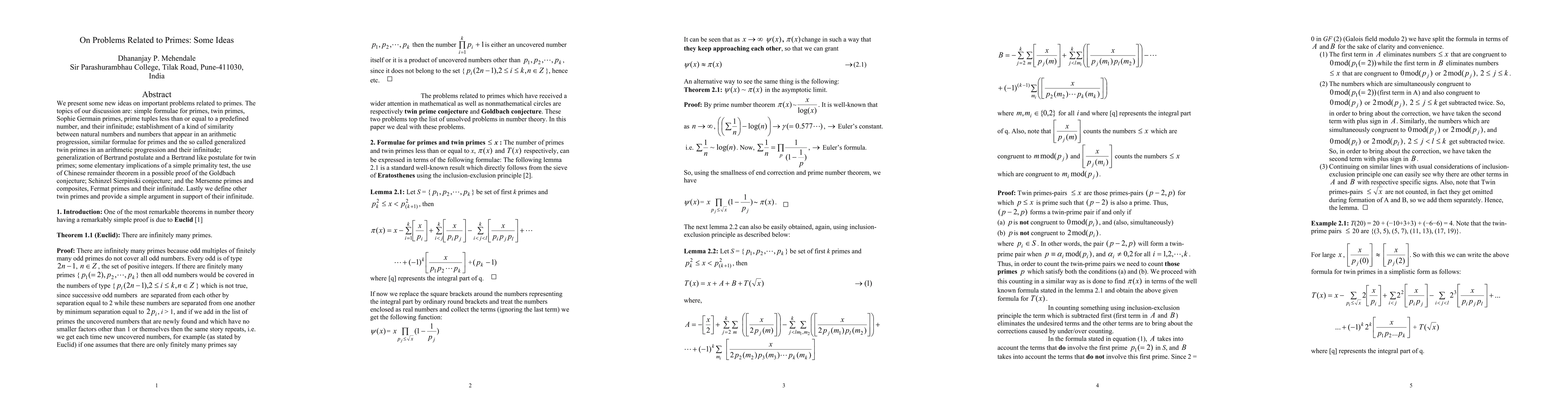 We present some new ideas on important problems related to primes. The topics of our discussion are: simple formulae for primes, twin primes, Sophie Germain primes, prime tuples less than or equal to a predefined number, and their infinitude; establishment of a kind of similarity between natural numbers and numbers that appear in an arithmetic progression, similar formulae for primes and the so called generalized twin primes in an arithmetic progression and their infinitude; generalization of Bertrand postulate and a Bertrand like postulate for twin primes; some elementary implications of a simple primality test, the use of Chinese remainder theorem in a possible proof of the Goldbach conjecture; Schinzel Sierpinski conjecture; and the Mersenne primes and composites, Fermat primes and their infinitude. Lastly we define other twin primes and provide a simple argument in support of their infinitude.