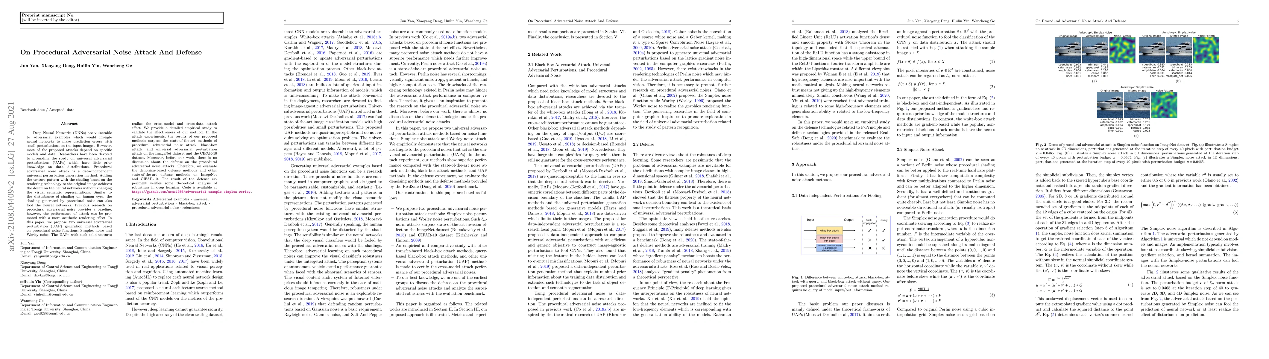 This paper proposes two universal adversarial perturbation (UAP) generation methods using procedural noise functions—Simplex and Worley noise—to create data-free, gradient-free adversarial attacks on deep neural networks. The generated adversarial examples, created without altering the input's semantic content, demonstrate superior attack performance on visual classification tasks.